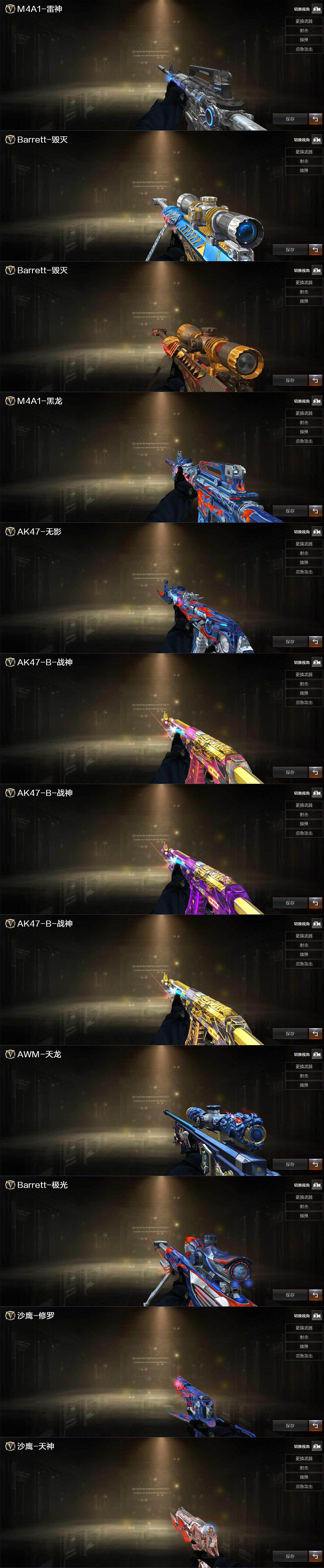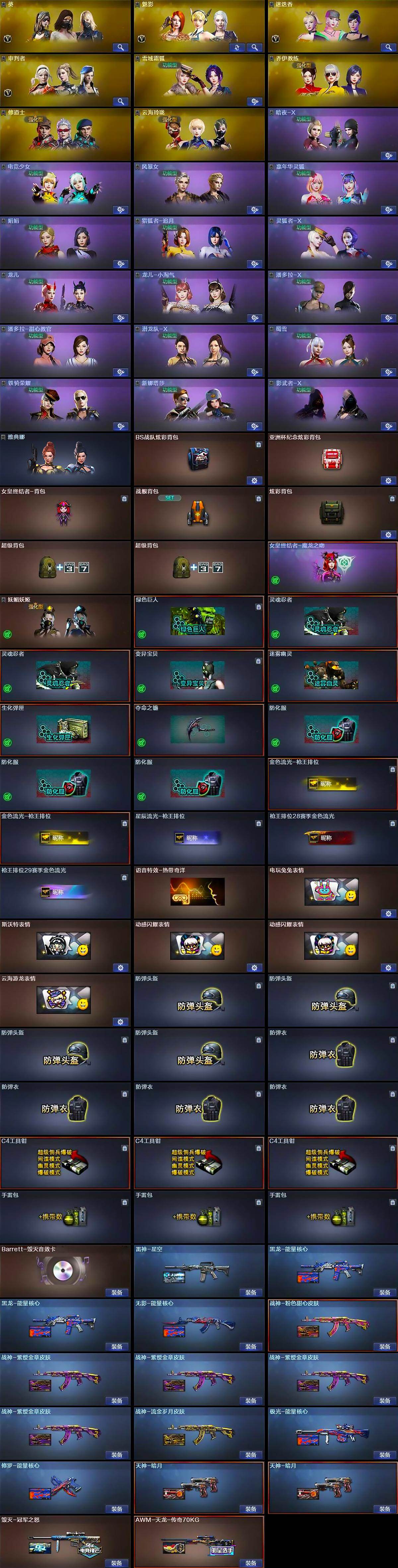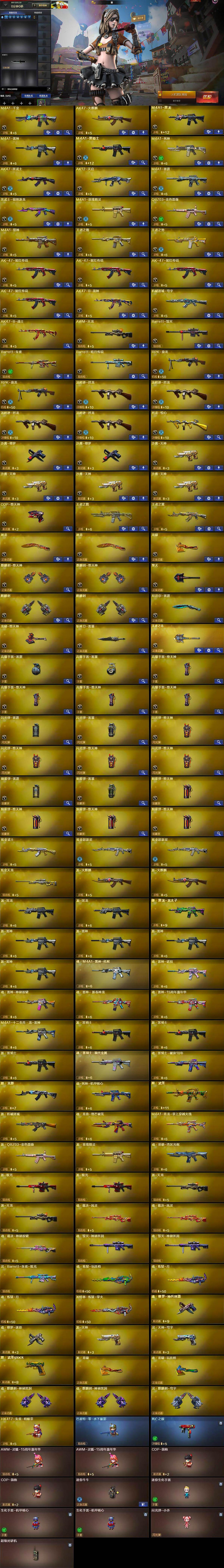 【英雄级武器】:M4A1-千变,AK47-火麒麟,M4A1-黑龙,M4A1-雷神,M4A1-黑骑士,M4A1-死神,AK47-黑武士,AK12-天启,M4A1-雷霆,黑武士-锦绣游龙,M4A1-玫瑰精灵,QBZ03-金色蔷薇,M4A1-猎神,王者之魄-觉醒版,王者之势-觉醒版,AK-47-猩红传说*4,AK47-B-战神,机械迷城-穹宇,AK47-B-战士,AWM-天龙,Barrett-毁灭,Barrett-朱雀,Barrett-暗月传说,RPK-盘龙*2,汤姆逊-烈龙*4,烈龙-悦心-觉醒版,沙鹰-修罗*2,沙鹰-天神*4,COP-堕天神,屠龙*2,龙啸,麒麟刺-堕天神*2,擎天,麒麟刺*2,尼泊尔-雷霆,龙啸-堕天神,斩神刀-雷暴,王者之击-觉醒版,高爆手雷-雷霆,高爆手雷-雷暴,高爆手雷-堕天神*4,闪光弹-雷霆,闪光弹-雷暴,闪光弹-堕天神*4,烟雾弹-雷霆,烟雾弹-雷暴,烟雾弹-堕天神*4