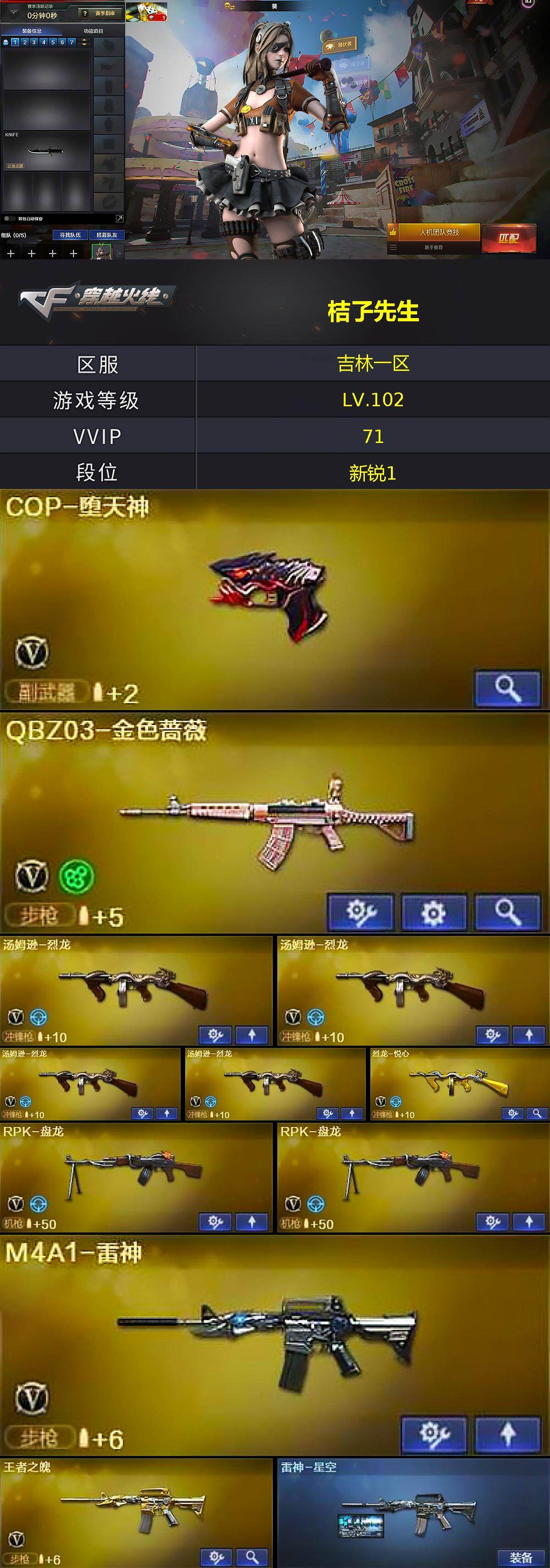 【热门武器】:QBZ03-金色蔷薇,死亡之眼,M4A1-黑骑士,汤姆逊-烈龙*4,RPK-盘龙*2,COP-堕天神,沙鹰-修罗*2