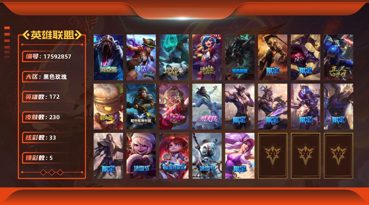 [17592857]可二次【特价出售/店主推荐】未定级段位-172英雄-230皮肤-33炫彩-0终极-5神话-20限定-28传说-54史诗