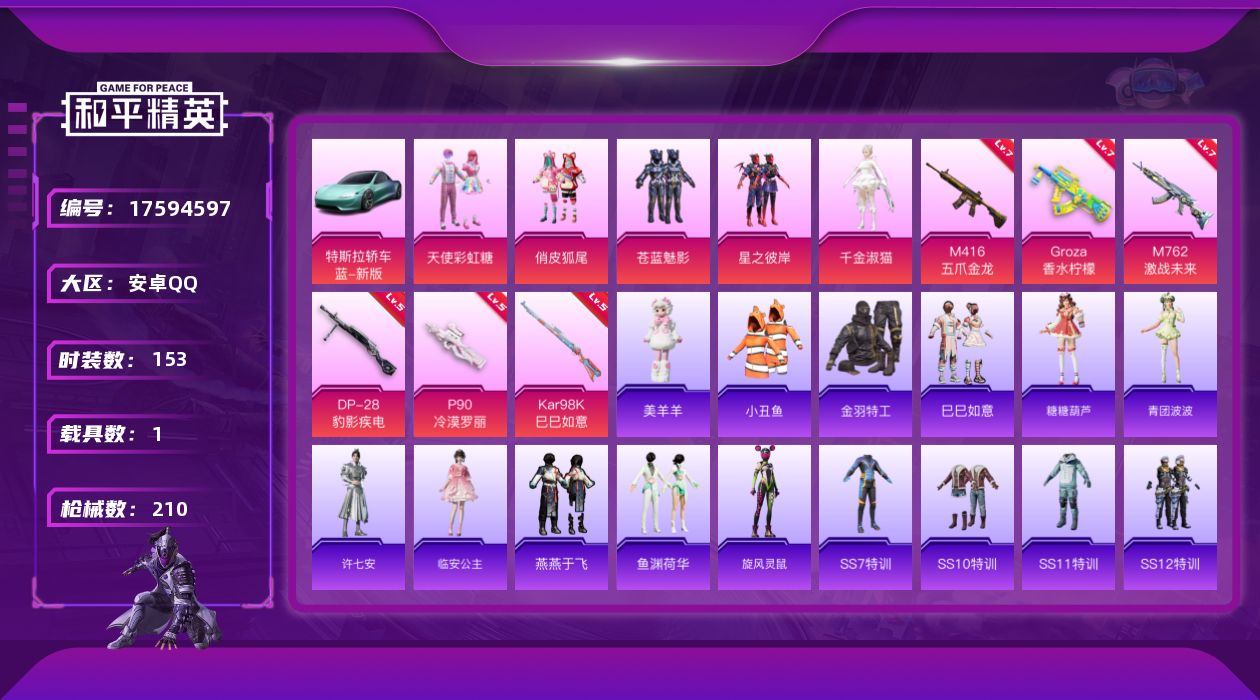 [17594597]【店主推荐捡漏号】安卓 手Q-5粉装-7特效枪-1载具-1粉色飞行器-66339热力值-8王牌印记-153套装-210枪皮【热门品类】:套装-小丑鱼,套装-金羽特工【粉色套装】:粉装-天使彩虹糖,粉装-俏皮狐尾,粉装-苍蓝魅影,粉装-星之彼岸,角色-千金淑猫【粉色枪皮等级】:M416-五爪金龙(七级),GROZA-香水柠檬(七级),M762-激战未来(七级),ACE32-萌骑漫游(四级),P90-冷漠罗丽(五级),Kar98K-巳巳如意(五级),DP-28-豹影疾电(五级)【粉色载具】:特斯拉Roadster(水滴蓝)【粉色枪皮】:M416-五爪金龙,GROZA-香水柠檬,M762-激战未来,ACE32-萌骑漫游,P90-冷漠罗丽,Kar98K-巳巳如意,DP-28-豹影疾电