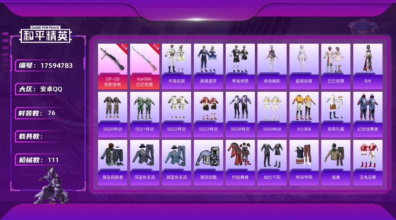 [17594783]【特价出售/店主推荐】 安卓 手Q-0粉装-5特效枪-0载具-1粉色飞行器-29232热力值-3王牌印记-76套装-111枪皮 【粉色枪皮等级】:ACE32-萌骑漫游(四级),AKS-74U-森灵之息(五级),Kar98K-巳巳如意(五级),Mk14-福马献瑞(五级),DP-28-豹影疾电(五级) 【粉色枪皮】:ACE32-萌骑漫游,AKS-74U-森灵之息,Kar98K-巳巳如意,Mk14-福马献瑞,DP-28-豹影疾电 【粉色飞行器】:炫彩糖果飞行器 【粉色降落伞】:海渊国主降落伞,月影灵韵降落伞,异瞳寒姬降落伞,炫彩糖果降落伞 【稀有套装】:套装-巳巳如意,角色-超感刻度,套装-雪国风尚,套装-炫彩糖果,角色-X,套装-马上有钱,角色-风玲,角色-绯色魅影,套装-书海巡游,套装-画境星梦,套装-琴音绮想,角色-月烬之祷,套装-雨过天青,套装-红釉青花 【稀有枪皮】:AUG-冰晶雪宝,AKM-破晓战魂,AKM-龙的传人,M16A4-幻世战舞者,M16A4-千金淑猫,SCAR-L-夜灯,SCAR-L-炫彩节奏,SCAR-L-玉兔迎春,SCAR-L-红色方程式,M416-蓝色火焰,GROZA-银河战甲,AUG-天降萌叽,AUG-绝对恒星,QBZ-彩虹符号,M762-天降萌叽,M762-彩虹符号,M762-登顶巅峰,AC-VAL-天降萌叽,蜜獾-天降萌叽,ACE32-画境星梦,UZI-天降萌叽,UMP45-夜灯,UMP45-生命誓言,汤姆逊-天降萌叽,汤姆逊-奇异狩猎者,汤姆逊-像素花束,MP5K-画境星梦,P90-巳巳如意,Kar98K-王子的夏天,M24-影袭,M24-炫彩节奏,SKS-炫彩节奏,AMR-喜羊羊与灰太狼,AMR-鬼刀,M1加兰德-画境星梦,S686-生命誓言,S686-巳巳如意,S12K-夜灯,S12K-极意拳锋,DBS-第五大道,DBS-月影灵韵,AA12-G-画境星梦,DP-28-彩虹符号,MG3-幻世战舞者,P18C-百万伏特,蝎式手枪-千金淑猫,平底锅-画境星梦,破片手榴弹-巳巳如意 【其他套装】:套装-SS20特训,套装-SS21特训,套装-SS22特训,套装-SS23特训,套装-SS28特训,套装-SS29特训,套装-光之冒险,套装-吉莉礼服,套装-幻世战舞者,套装-海岛探路者,套装-深蓝色名流,套装-湖蓝色名流,套装-潮流炫酷,套装