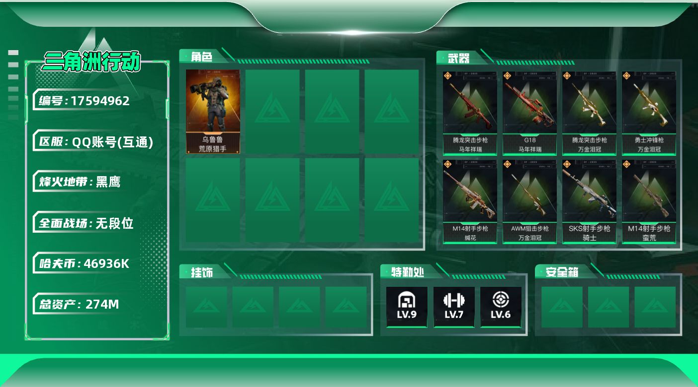 [17594962]274m总资产-46936k哈伏币-60烽火等级-黑鹰-1战场等级-无军衔 【干员外观】:乌鲁鲁-荒原猎手,蛊-不羁人生 【近战皮肤】:近战-处刑者2级,近战-黑鹰 【传说外观】:AUG突击步枪-悠然茶歇,SCAR-H战斗步枪-荼蘼,腾龙突击步枪-马年祥瑞,腾龙突击步枪-万金泪冠,MK47突击步枪-悠然茶歇,UZI冲锋枪-悠然茶歇,SR-3M紧凑突击步枪-荼蘼,勇士冲锋枪-万金泪冠,PKM通用机枪-荼蘼,M14射手步枪-蛮荒,M14射手步枪-缄花,SKS射手步枪-骑士,AWM狙击步枪-万金泪冠,G18-马年祥瑞 【史诗外观】:K416突击步枪-冬日风情,K416突击步枪-腊梅,K416突击步枪-阿萨拉特攻,AUG突击步枪-蝮蛇,SG552突击步枪-哈夫克警备,G3战斗步枪-哈夫克警备,K437突击步枪-丛影谍踪,MP5冲锋枪-竞技风,Vector冲锋枪-猎鳄行动,SR-3M紧凑突击步枪-开工大吉,勇士冲锋枪-丛影谍踪,MP7冲锋枪-六套之力,M249轻机枪-丛影谍踪,QJB201轻机枪-炽焰,VSS射手步枪-丛影谍踪,M14射手步枪-工业狂潮, M14射手步枪-航天庆典,M700狙击步枪-哈夫克警备 【稀有外观】:S12K霰弹枪-海岸线,SR-3M紧凑突击步枪-巨兽,AKM突击步枪-肃杀,K416突击步枪-一帆风顺,SG552突击步枪-2026,SG552突击步枪-马年新春,SG552突击步枪-贴花艺术, AK-12突击步枪-马年新春,SCAR-H战斗步枪-荣耀列队,CAR-15突击步枪-来财,KC17突击步枪-来财,MP5冲锋枪-弄臣,MP5冲锋枪-哈夫克卫队,UZI冲锋枪-精英联盟,SMG-45冲锋枪-行动开启,SR-3M紧凑突击步枪-马年新春,勇士冲锋枪-冰天雪地,QCQ171冲锋枪-银鹭,M1014霰弹枪-幻影结构,M249轻机枪-冰天雪地,QJB201轻机枪-哈夫克卫队,Mini-14射手步枪-来财,SR-25射手步枪-开拓,SV-98狙击步枪-星链科技,SV-98狙击步枪-哈夫克航天,SV-98狙击步枪-精英联盟,QSZ92G-一帆风顺 【普通外观】:G18-彩墨涂鸦,M4A1突击步枪-粉色涂装,M4A1突击步枪-高雅黑,M4A1突击步枪-海色,QBZ95-1突击步枪-高雅黑,QBZ95-1突击步枪-海浪,QBZ95-1突击步枪-海色,QBZ95-1突