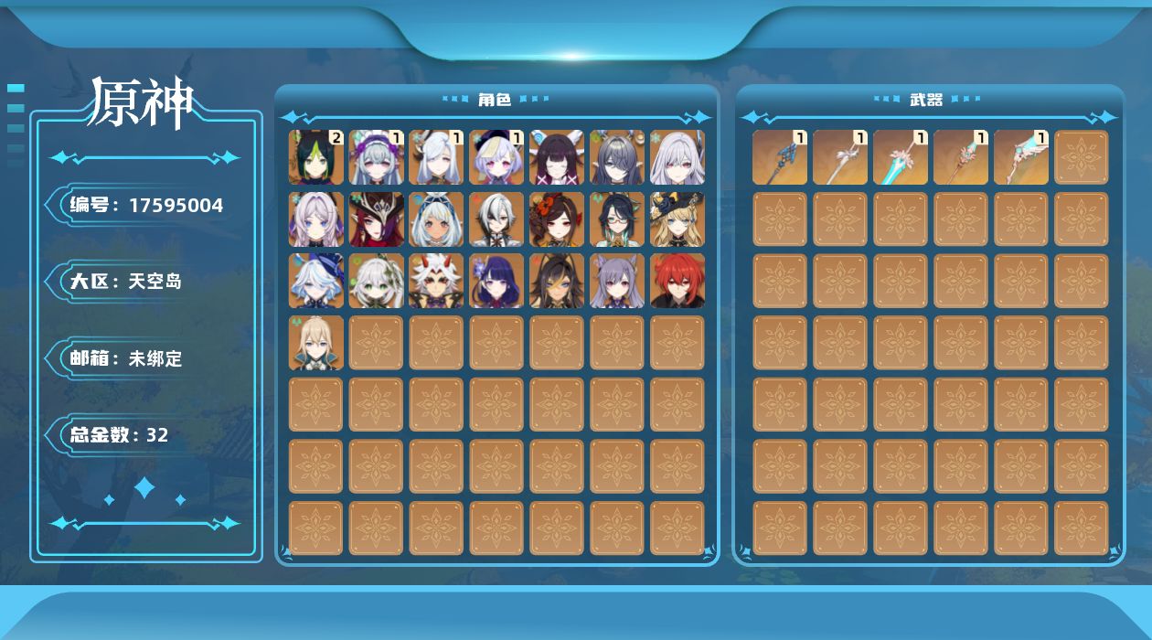 [17595004]59级/32黄/女主/22个五星角色/5个五星武器 0命阿蕾奇诺,0命千织,0命闲云,0命娜维娅,0命芙宁娜,0命迪希雅,0命纳西妲,2命提纳里,1命申鹤,0命荒泷一斗,0命雷电将军,0命刻晴,1命七七,0命琴,0命迪卢克,0命玛拉妮,0命恰斯卡,0命茜特菈莉,1命梦见月瑞希,0命丝柯克,0命菈乌玛,0命哥伦比娅,精1息灾,精1天空之脊,精1天空之翼,精1风鹰剑,精1天空之傲