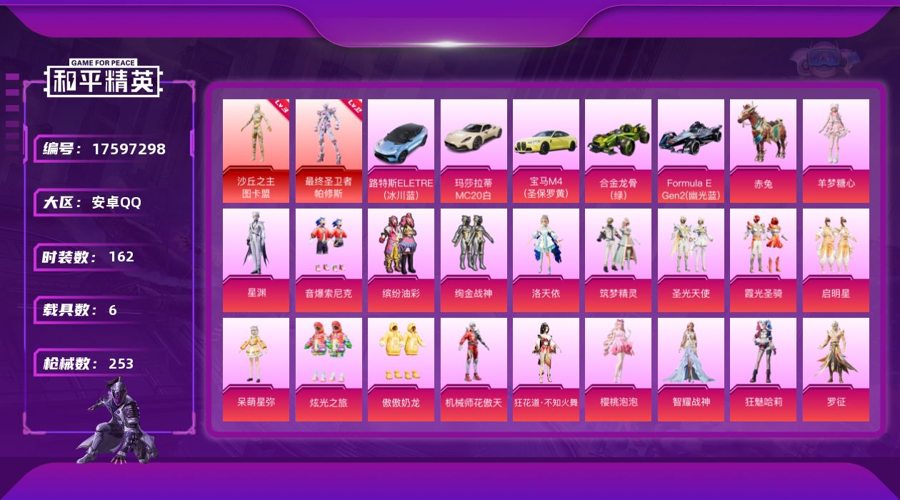 安卓 手Q-无敌战神框-2神装-19粉装-20特效枪-6载具-6粉色飞行器-95155热力值-18王牌印记-162套装-253枪皮