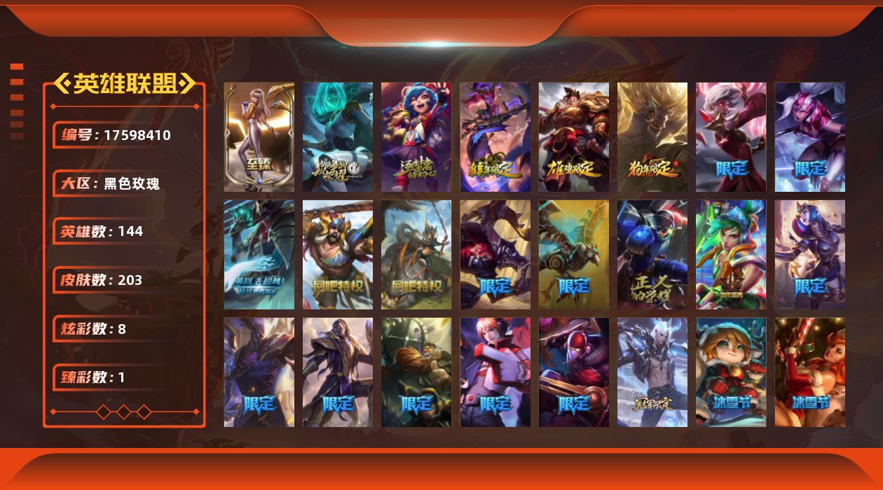 未定级段位-144英雄-203皮肤-8炫彩-0终极-4神话-29限定-13传说-59史诗