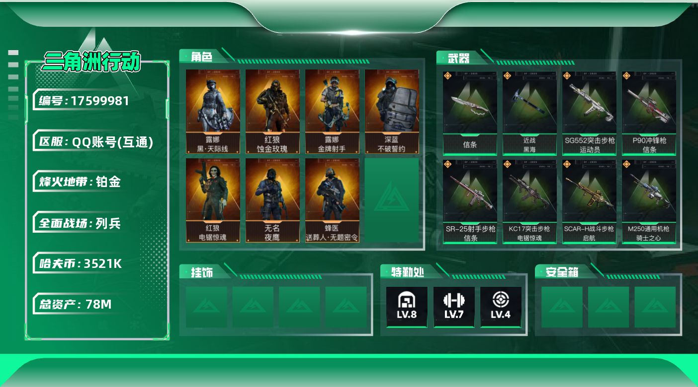 [17599981]78m总资产-3521k哈伏币-60烽火等级-铂金-18战场等级-列兵 【干员外观】:红狼-蚀金玫瑰,露娜-黑·天际线,蜂医-送葬人·无题密令,无名-夜鹰,深蓝-不破誓约,红狼-电锯惊魂,露娜-金牌射手 【近战皮肤】:近战-信条,近战-黑海,近战-黑鹰 【传说外观】:M4A1突击步枪-蚀金玫瑰,M4A1突击步枪-阿米娅,SG552突击步枪-运动员,AK-12突击步枪-夜鹰,AK-12突击步枪-特斯拉线圈,SCAR-H战斗步枪-启航,CAR-15突击步枪-阿米娅,腾龙突击步枪-捞点薯条,KC17突击步枪-电锯惊魂,MP5冲锋枪-黑海,P90冲锋枪-信条,UZI冲锋枪-特斯拉线圈,SMG-45冲锋枪-骑士,SR-3M紧凑突击步枪-特斯拉线圈,勇士冲锋枪-能天使-午夜邮差,725双管霰弹枪-送葬人-无题密令,M250通用机枪-骑士之心,QJB201轻机枪-黑海,M14射手步枪-电锯惊魂,SR-25射手步枪-水墨云图,SR-25射手步枪-信条,AWM狙击步枪-捞点薯条,93R-捞点薯条,复合弓-黑·天际线 【史诗外观】:AKM突击步枪-林中猎手,QBZ95-1突击步枪-曙光,ASh-12战斗步枪-守夜人,ASh-12战斗步枪-无极限,M16A4突击步枪-竞赛选手,AUG突击步枪-蝮蛇,M7战斗步枪-百步穿杨,SG552突击步枪-尖端治疗,SCAR-H战斗步枪-囚徒,G3战斗步枪-流沙送葬,G3战斗步枪-哈夫克警备,AS Val突击步枪-尖端治疗,AS Val突击步枪-百步穿杨,腾龙突击步枪-无垢,K437突击步枪-守护者,MP5冲锋枪-战术竞备,MP5冲锋枪-竞技风,P90冲锋枪-紧急戒备,Vector冲锋枪-阿萨拉文明,Vector冲锋枪-百步穿杨,SR-3M紧凑突击步枪-荒野求生,SR-3M紧凑突击步枪-战术竞备,勇士冲锋枪-深海恐惧,勇士冲锋枪-工业狂潮,MP7冲锋枪-无垢,MP7冲锋枪-守护者,M1014霰弹枪-林中猎手,PKM通用机枪-蝮蛇,PKM通用机枪-守夜人,PKM通用机枪-荒野求生,QJB201轻机枪-Old Habits,Mini-14射手步枪-守护者,SVD狙击步枪-阿萨拉工艺,SVD狙击步枪-暗夜猎手,SVD狙击步枪-荒野求生,SR-25射手步枪-尖端治疗,PSG-1射手步枪-无垢,SV-98狙击步枪-林中猎手,SV-98狙击步枪-囚徒,SV-98