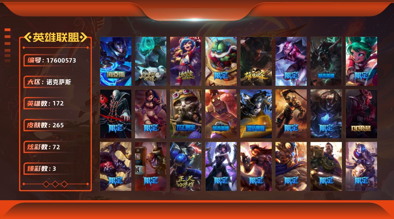 [17600573]铂金段位-172英雄-265皮肤-72炫彩-0终极-4神话-44限定-19传说-65史诗
