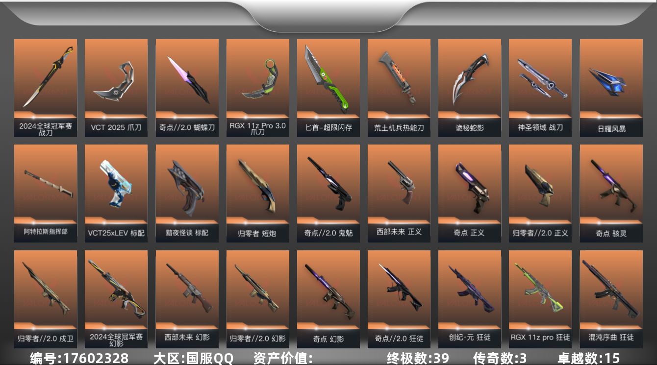 [17602328]【特价出售/店主推荐】 【套装】:2024全球冠军赛套装,VCT 2025 赛季套装,西部未来套装,归零者//2.0套装,奇点//2.0套装,回火礼包:奇点套装,般若假面//2.0套装,掠影套装 【英雄】:幻棱,炼狱,维斯,暮蝶,钛狐,壹决,铁臂,捷风,雷兹,幽影,不死鸟,贤者,猎枭,蝰蛇,零,芮娜,奇乐,尚勃勒,霓虹,斯凯,夜露,星礈,K/O,海神,盖可,黑梦,钢锁 【近战武器】:近战武器-2024全球冠军赛 战刀,近战武器-奇点//2.0 蝴蝶刀,近战武器-VCT 2025 爪刀,近战武器-RGX 11z Pro//3.0 爪刀,近战武器-鬼丸国纲,近战武器-未来开拓者,近战武器-超限闪存 匕首,近战武器-荒土机兵 热能刀,近战武器-生物分子解离器,近战武器-影刃,近战武器-诡秘蛇影 军刀,近战武器-神圣领域 战刀,近战武器-日耀风暴 遗器,近战武器-阿特拉斯指挥部 甩棍 【狂徒】:狂徒-洪荒怒焰,狂徒-混沌序曲,狂徒-奇点//2.0,狂徒-创·纪元,狂徒-RGX 11z Pro,狂徒-ORA x 颗秒,狂徒-般若假面//2.0,狂徒-掠影,狂徒-盖亚的复仇,狂徒-日冕雄师,狂徒-紫阙金琅,狂徒-离子武器//2.0,狂徒-超能偶像,狂徒-荒土机兵,狂徒-诡秘蛇影 【幻影】:幻影-2024全球冠军赛,幻影-归零者//2.0,幻影-奇点,幻影-西部未来,幻影-侦察力量,幻影-超限闪存,幻影-神圣领域,幻影-纳米打击,幻影-末日之翼,幻影-西部未来 【戍卫】:戍卫-归零者//2.0,戍卫-掠影,戍卫-天界神兵,戍卫-超能偶像,戍卫-浮光跃金,戍卫-逆冲蛮牛,戍卫-月球哨兵,戍卫-折光棱晶 【獠犬】:獠犬-源能者娱乐系统,獠犬-般若假面//2.0,獠犬-神圣领域,獠犬-采蜜小蜂队,獠犬-模拟赫兹,獠犬-逆冲蛮牛 【冥驹】:冥驹-千灵华绽,冥驹-掠影,冥驹-荒土机兵,冥驹-模拟赫兹,冥驹-星云暗涌 【飞将】:飞将-黯夜怪谈,飞将-西部未来,飞将-聚合之力,飞将-末日之翼 【莽侠】:莽侠-RGX 11z Pro//3.0,莽侠-归零者//2.0,莽侠-超限闪存,莽侠-诡秘蛇影,莽侠-月球哨兵 【战神】:战神-般若假面//2.0,战神-神圣领域,战神-采蜜小蜂队,战神-浮光跃金 【奥丁】:奥丁-西部未来,奥丁-纳米打击,奥丁-末日之翼 【判官】:判官-超能偶像,判官-诡秘蛇