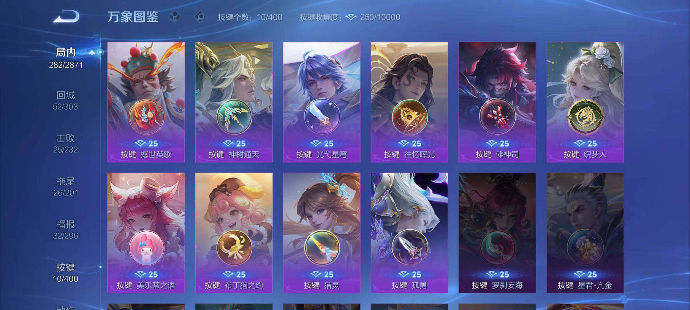 - [14778524]按键6 安卓Q-134皮肤-1珍品传说-5传说-31史诗 【珍品传说】:安琪拉酷洛米之心 【传说皮肤】:妲己愿照众生和,蔡文姬愿照福禄聚,桑启鸣野蒿,王昭君乞巧织情,貂蝉仲夏夜之梦 【限定皮肤】:大乔绒语心约,姜子牙天穹之誓,狄仁杰阴阳师,赵云皇家上将,孙尚香蔷薇恋人,狄仁杰魔术师,达摩沙漠行僧,项羽海滩派对,兰陵王金庭之子,李元芳云中旅人,苏烈千军破阵,沈梦溪大漠名商,裴擒虎擒涛扼浪,鲁班大师探海日志,桑启海盐诗旅,张良古海寻踪,鬼谷子天穹祈灯,沈梦溪龙舞盛年,刘邦剑破天穹,程咬金群星魔术团,周瑜熔金海岸 【赛季限定】:达摩沙漠行僧,兰陵王金庭之子,张良古海寻踪,李元芳云中旅人,苏烈千军破阵,沈梦溪大漠名商,裴擒虎擒涛扼浪,鲁班大师探海日志,桑启海盐诗旅,鬼谷子天穹祈灯,刘邦剑破天穹,姜子牙天穹之誓 【史诗皮肤】:赵云皇家上将,貂蝉圣诞恋歌,王昭君偶像歌手,狄仁杰魔术师,宫本武藏鬼剑武藏,孙尚香蔷薇恋人,孙尚香水果甜心,嬴政摇滚巨星,妲己魅力维加斯,墨子龙骑士,吕布圣诞狂欢,李白千年之狐,张飞乱世虎臣,刘邦德古拉伯爵,小乔缤纷独角兽,雅典娜冰冠公主,安琪拉心灵骇客,蔡文姬舞动绿茵,李元芳逐浪之夏,白起星夜王子,狄仁杰鹰眼统帅,小乔青蛇,孙尚香时之恋人,貂蝉唤灵魅影,阿轲化蝶舞,狂铁龙之律动,后羿石田雨龙,黄忠百相守梦,公孙离涂山容容,女娲万灵启世,少司缘巫礼祀神 【其他皮肤】:项羽海滩派对,韩信街头霸王,露娜哥特玫瑰,芈月红桃皇后,程咬金星际陆战队,白起白色死神,武则天东方不败,扁鹊化身博士,扁鹊救世之瞳,宫本武藏未来纪元,安琪拉玩偶对对碰,孙膑天使之翼,妲己少女阿狸,典韦黄金武士,花木兰兔女郎,甄姬花好人间,宫本武藏万象初新,后羿阿尔法小队,狄仁杰阴阳师,墨子进击墨子号,钟无艳海滩丽影,狂铁命运角斗场,孙尚香沉稳之力,李白敏锐之力,大乔守护之力,明世隐虹云星官,孙膑归虚梦演,姜子牙炽热元素使,刘禅秘密基地,张良缤纷绘卷,鲁班大师乓乓大师,苏烈千军破阵,达摩沙漠行僧,兰陵王金庭之子,沈梦溪大漠名商,李元芳云中旅人,桑启海盐诗旅,裴擒虎擒涛扼浪,鲁班大师探海日志,哪吒热血海滩,张良古海寻踪,后羿完美运算,鬼谷子天穹祈灯,朵莉亚金色潮汐,沈梦溪龙舞盛年,刘邦剑破天穹,程咬金群星魔术团,貂蝉长夏之忆,姜子牙天穹之誓,周瑜熔金海岸,大乔绒语心约,盘古敬我三分,东皇太一噬