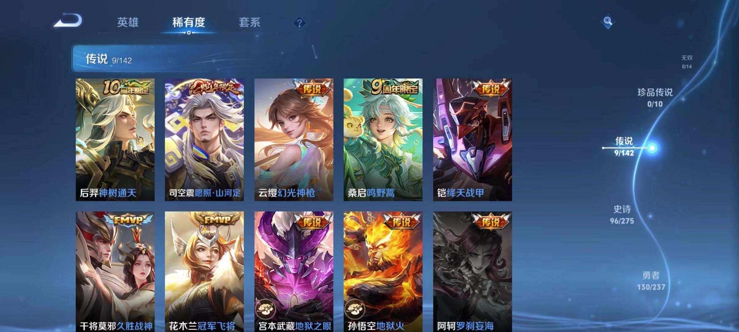 【传说皮肤】:后羿神树通天,司空震愿照山河定,云缨幻光神枪,桑启鸣野蒿,铠绛天战甲,干将莫邪久胜战神,花木兰冠军飞将,宫本武藏地狱之眼,孙悟空地狱火