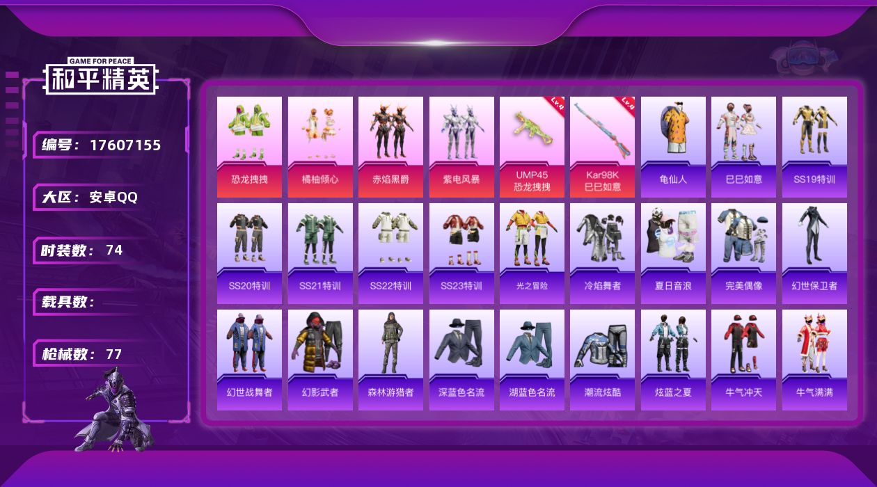 [17607155]可二次【特价出售/店主推荐】安卓 手Q-4粉装-3特效枪-3粉色飞行器-24354热力值-1王牌印记-74套装-77枪皮【热门品类】:套装-龟仙人【粉色套装】:粉装-恐龙拽拽,粉装-橘柚倾心,粉装-赤焰黑爵,粉装-紫电风暴【粉色枪皮等级】:UMP45-恐龙拽拽(四级),Kar98K-巳巳如意(四级),Mk14-福马献瑞(三级)【粉色枪皮】:UMP45-恐龙拽拽,Kar98K-巳巳如意,Mk14-福马献瑞【粉色飞行器】:庄周梦蝶飞行器,冷魅冰骑飞行器,太空嘟嘟飞行器