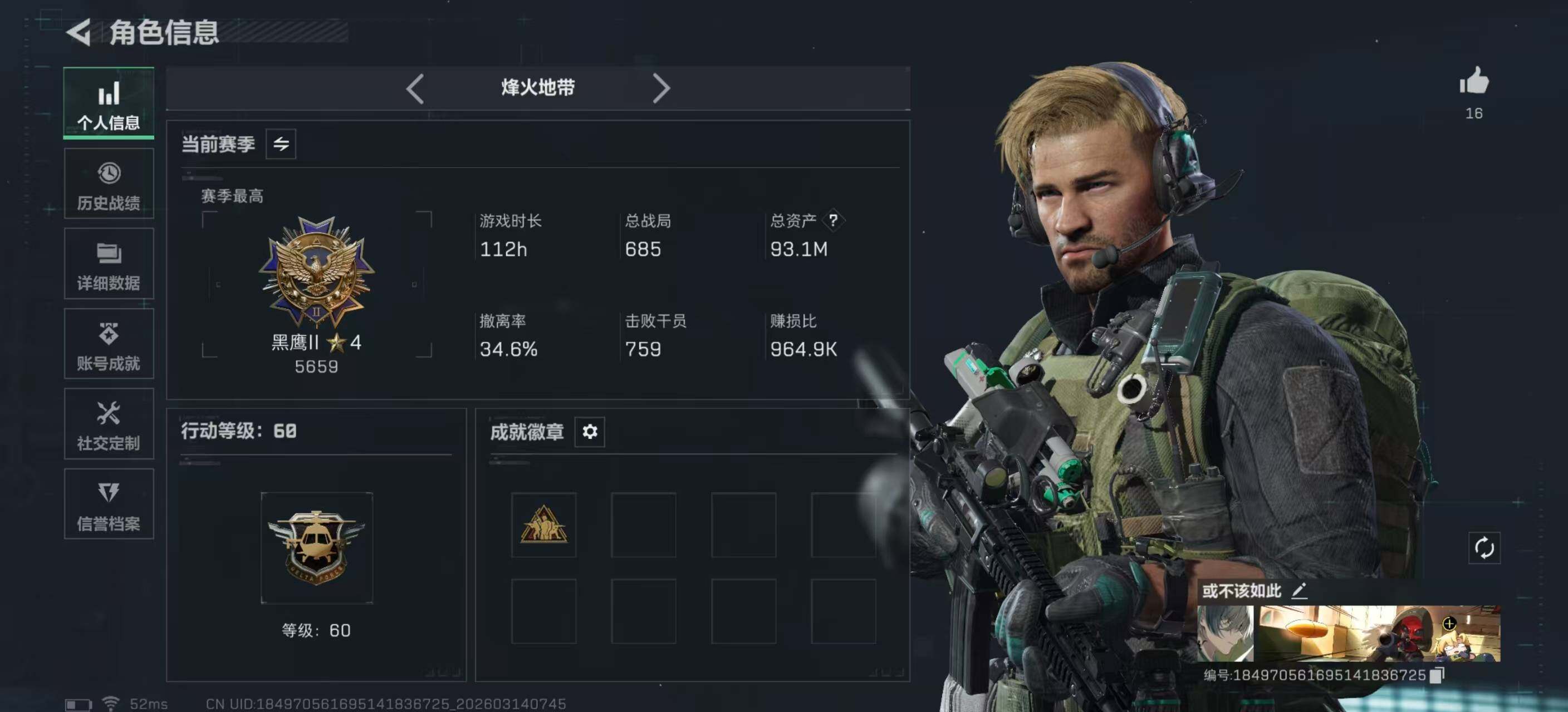 [17606924]【特价出售/店主推荐】93m总资产-412k哈伏币-60烽火等级-黑鹰-26战场等级-军士长