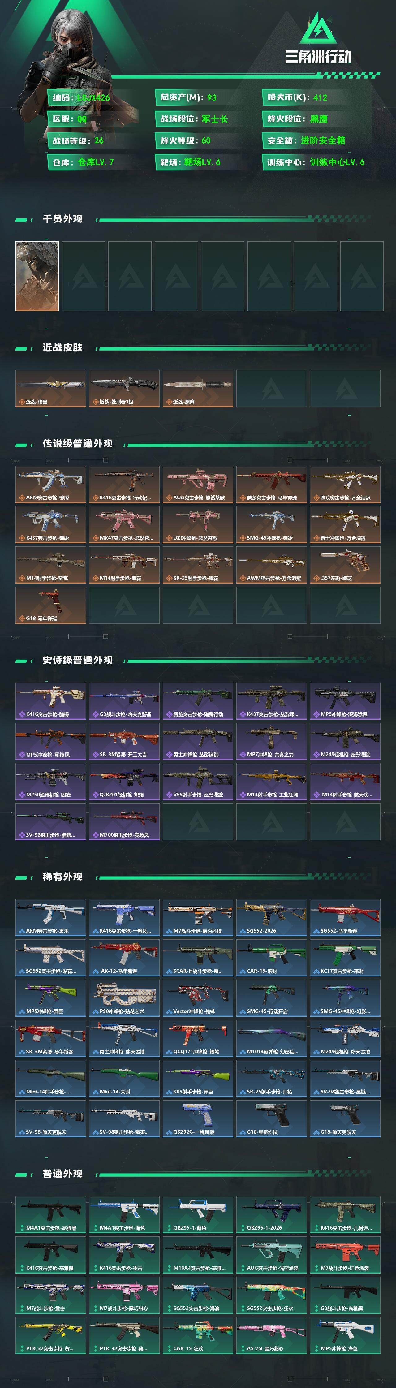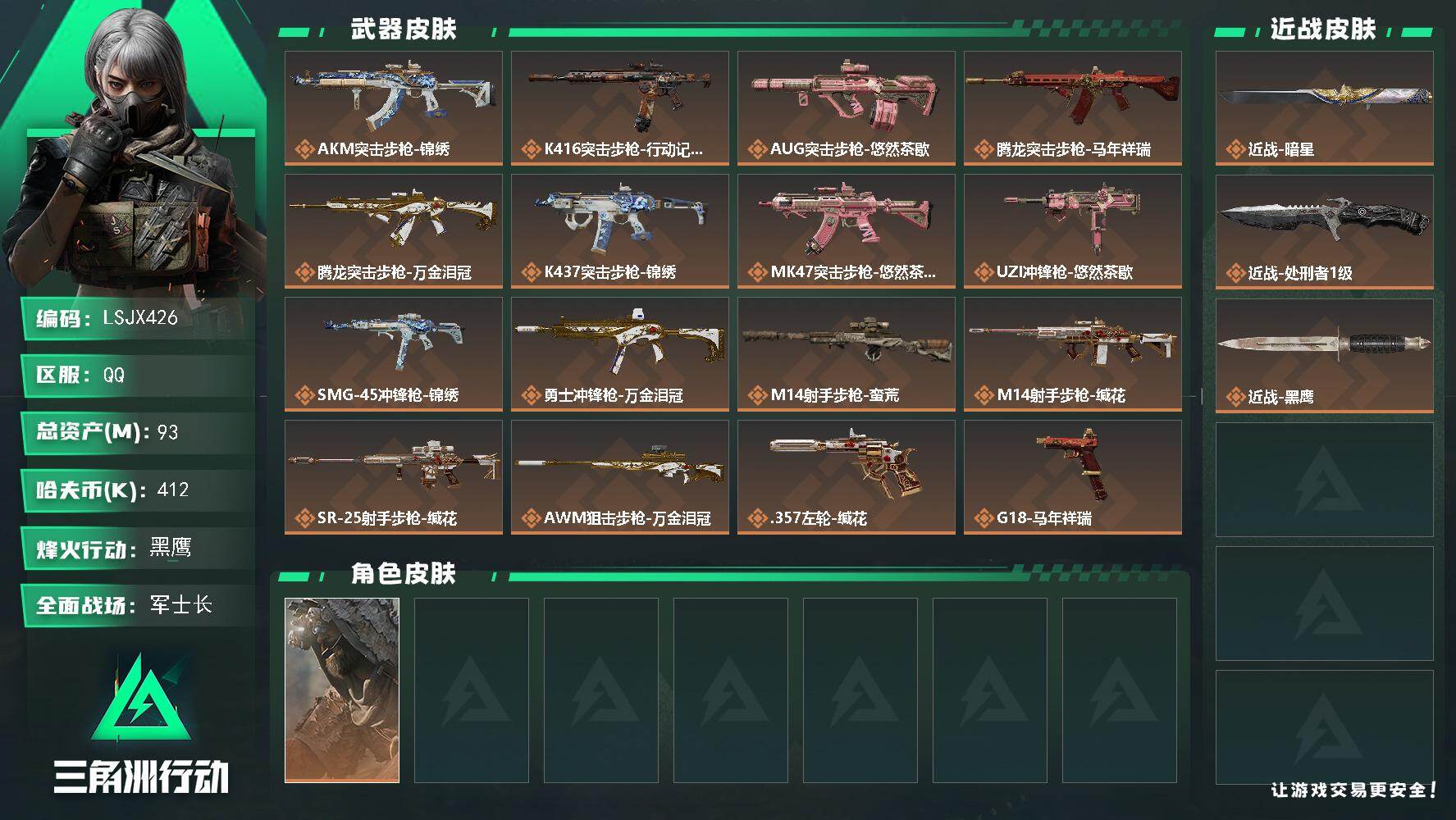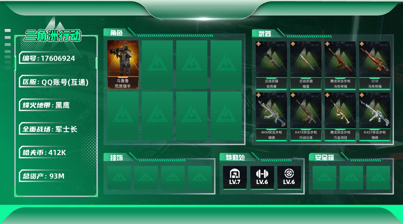 [17606924]【特价出售/店主推荐】93m总资产-412k哈伏币-60烽火等级-黑鹰-26战场等级-军士长 【干员外观】:乌鲁鲁-荒原猎手 【近战皮肤】:近战-暗星,近战-处刑者1级,近战-黑鹰 【传说外观】:AKM突击步枪-锦绣,K416突击步枪-行动记录,AUG突击步枪-悠然茶歇,腾龙突击步枪-马年祥瑞,腾龙突击步枪-万金泪冠,K437突击步枪-锦绣,MK47突击步枪-悠然茶歇,UZI冲锋枪-悠然茶歇,SMG-45冲锋枪-锦绣,勇士冲锋枪-万金泪冠,M14射手步枪-蛮荒,M14射手步枪-缄花,SR-25射手步枪-缄花,AWM狙击步枪-万金泪冠,.357左轮-缄花,G18-马年祥瑞 【史诗外观】:K416突击步枪-腊梅,G3战斗步枪-哈夫克警备,腾龙突击步枪-猎鳄行动,K437突击步枪-丛影谍踪,MP5冲锋枪-深海恐惧,MP5冲锋枪-竞技风,SR-3M紧凑突击步枪-开工大吉,勇士冲锋枪-丛影谍踪,MP7冲锋枪-六套之力,M249轻机枪-丛影谍踪,M250通用机枪-囚徒,QJB201轻机枪-炽焰,VSS射手步枪-丛影谍踪,M14射手步枪-工业狂潮, M14射手步枪-航天庆典,SV-98狙击步枪-猎鳄行动,M700狙击步枪-竞技风 【稀有外观】:AKM突击步枪-肃杀,K416突击步枪-一帆风顺,M7战斗步枪-前沿科技,SG552突击步枪-2026,SG552突击步枪-马年新春,SG552突击步枪-贴花艺术, AK-12突击步枪-马年新春,SCAR-H战斗步枪-荣耀列队,CAR-15突击步枪-来财,KC17突击步枪-来财,MP5冲锋枪-弄臣,P90冲锋枪-贴花艺术,Vector冲锋枪-先锋,SMG-45冲锋枪-行动开启,SMG-45冲锋枪-幻影结构,SR-3M紧凑突击步枪-马年新春,勇士冲锋枪-冰天雪地,QCQ171冲锋枪-银鹭,M1014霰弹枪-幻影结构,M249轻机枪-冰天雪地,Mini-14射手步枪-荣耀列队,Mini-14射手步枪-来财,SKS射手步枪-弄臣,SR-25射手步枪-开拓,SV-98狙击步枪-星链科技,SV-98狙击步枪-哈夫克航天,SV-98狙击步枪-精英联盟,QSZ92G-一帆风顺,G18-星链科技,G18-哈夫克航天 【普通外观】:M4A1突击步枪-高雅黑,M4A1突击步枪-海色,QBZ95-1突击步枪-海色,QBZ95-1突击步枪-2026,K416突击