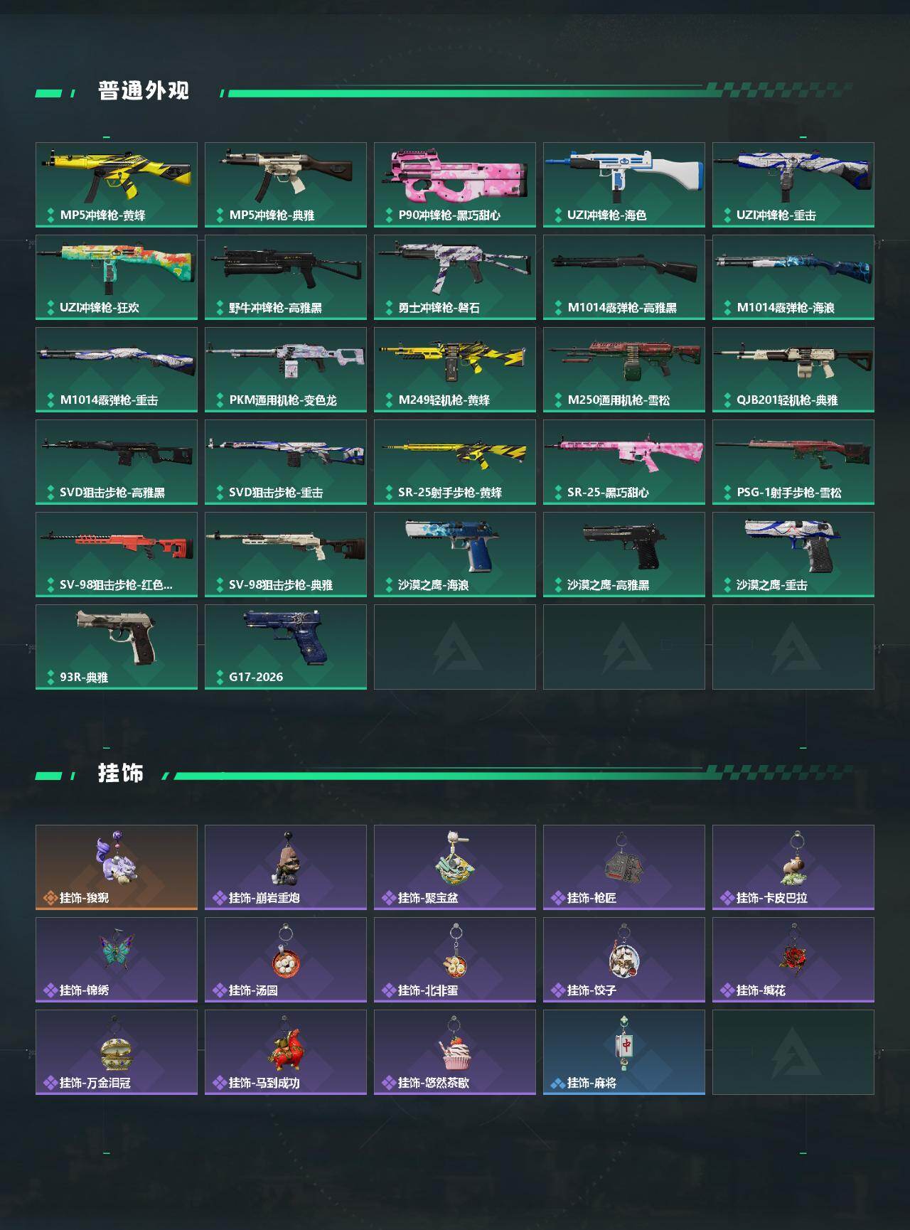 【稀有外观】:AKM突击步枪-肃杀,K416突击步枪-一帆风顺,M7战斗步枪-前沿科技,SG552突击步枪-2026,SG552突击步枪-马年新春,SG552突击步枪-贴花艺术, AK-12突击步枪-马年新春,SCAR-H战斗步枪-荣耀列队,CAR-15突击步枪-来财,KC17突击步枪-来财,MP5冲锋枪-弄臣,P90冲锋枪-贴花艺术,Vector冲锋枪-先锋,SMG-45冲锋枪-行动开启,SMG-45冲锋枪-幻影结构,SR-3M紧凑突击步枪-马年新春,勇士冲锋枪-冰天雪地,QCQ171冲锋枪-银鹭,M1014霰弹枪-幻影结构,M249轻机枪-冰天雪地,Mini-14射手步枪-荣耀列队,Mini-14射手步枪-来财,SKS射手步枪-弄臣,SR-25射手步枪-开拓,SV-98狙击步枪-星链科技,SV-98狙击步枪-哈夫克航天,SV-98狙击步枪-精英联盟,QSZ92G-一帆风顺,G18-星链科技,G18-哈夫克航天