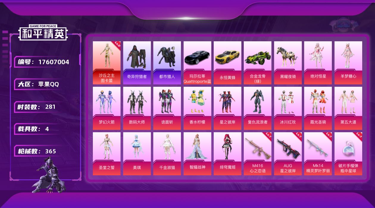 [17607004]苹果 手Q-1神装-17粉装-17特效枪-4载具-9粉色飞行器-129379热力值-24王牌印记-281套装-365枪皮