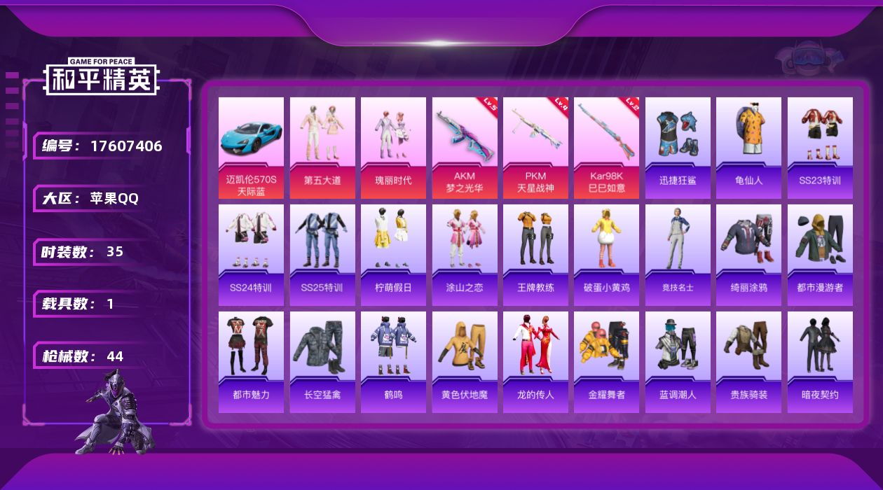 [17607406]【店主推荐捡漏号】苹果 手Q-2粉装-3特效枪-1载具-0粉色飞行器-15350热力值-1王牌印记-35套装-44枪皮【热门品类】:套装-龟仙人【粉色套装】:粉装-第五大道,粉装-瑰丽时代【粉色枪皮等级】:AKM-梦之光华(五级),Kar98K-巳巳如意(二级),PKM-天星战神(四级)【粉色载具】:迈凯伦570S(天际蓝)【粉色枪皮】:AKM-梦之光华,Kar98K-巳巳如意,PKM-天星战神
