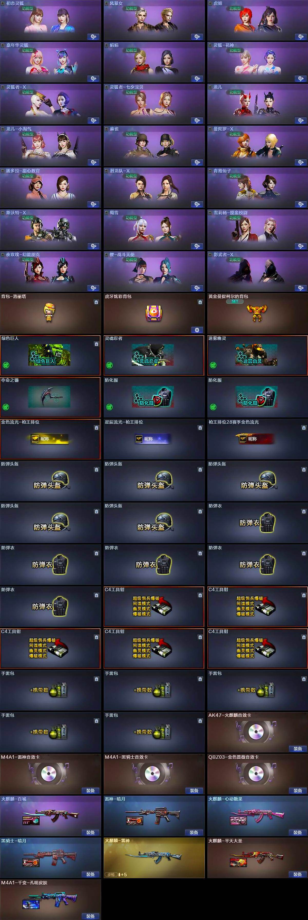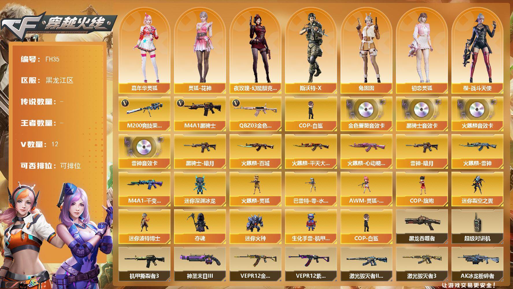 [17607659]黑龙江区-12V-0王者武器数-0炫金武器数 【热门武器】:QBZ03-金色蔷薇,M200-竞技荣光,M4A1-黑骑士,COP-白鲨 【音效卡】:AK47-火麒麟音效卡,M4A1-雷神音效卡,M4A1-黑骑士音效卡,QBZ03-金色蔷薇音效卡 【皮肤】:雷神-暗月,火麒麟-雷神,火麒麟-平天大圣,火麒麟-百城,火麒麟-心动糖果,M4A1-千变-孔明皮肤,黑骑士-暗月 【角色】:初恋灵狐,风暴女,虎妞,嘉年华灵狐,娟娟,灵狐-花神,灵狐者-X,灵狐者-七夕宝贝,龙儿,龙儿-小淘气,麻雀,曼陀罗-X,潘多拉-甜心教官,潜龙队-X,青霞仙子,斯沃特-X,蜀雪,兔囡囡,雪莉杨-摸金校尉,夜玫瑰-幻能朋克,樱-战斗天使,影武者-X 【人偶武器】:COP-白鲨,火麒麟-灵狐,巴雷特-零-水下丽影,AWM-灵狐-15周年嘉年华,COP-旗袍,迷你深渊冰龙,迷你裂空之翼*6,迷你波特博士,夺魂,迷你火种,生化手雷-机甲核心 【暴走生化】:黑龙吞噬者,超级对讲机 【挑战大师】:AK47-冰龙粉碎者,冰龙粉碎者-白马银枪,激光毁灭者III-白马银枪,VEPR-12-金魔,激光毁灭者III*4,机甲撕裂者III,神圣爆裂者-末日III*2,阐释者III,VEPR-12-紫魔 【英雄级武器】:AK47-火麒麟*2,M4A1-雷神,M4A1-黑骑士,无影-神兵利器,QBZ03-金色蔷薇,Barrett-毁灭,M200-竞技荣光,屠龙,高爆手雷-竞技荣光,烟雾弹-竞技荣光 【源级武器】:火麒麟-雷神,御·黑龙-龙太子,魂·雷神-新春神龙,魂-雷神-萌杀,魂·雷神-15周年嘉年华,御·雷神-机甲刑天,御·雷神-烈虎*2,M4A1-十二生肖·龙-雷神,魂·黑骑士-现代金属,魂·黑骑士-幻能朋克*3,魂·黑骑士-破浪10年,御·黑骑士·哪吒闹海,魂-死神-机甲核心,源·武圣*2,源·机械迷城,魂·龙血-锋芒破茧*2,源·青龙,魂·QBZ03-金色蔷薇-萌杀,源·玫瑰精灵,源·天龙,AWM-裁决-百城联赛天津,魂·裁决-凤灵*2,源·毁灭,魂·毁灭-航天科技,魂·毁灭-青帝*2,魂·毁灭-神秘黑洞*2,御·毁灭-黑大圣,魂·Barrett-朱雀- 新春神龙*2,魂·炼狱-电子连击,魂·炼狱-玩具枪,加特林-炼狱-掌火,御·炼狱-女娲,魂·修罗-15周年嘉年华,魂·修罗-现代金属,源·天神,源·武圣g