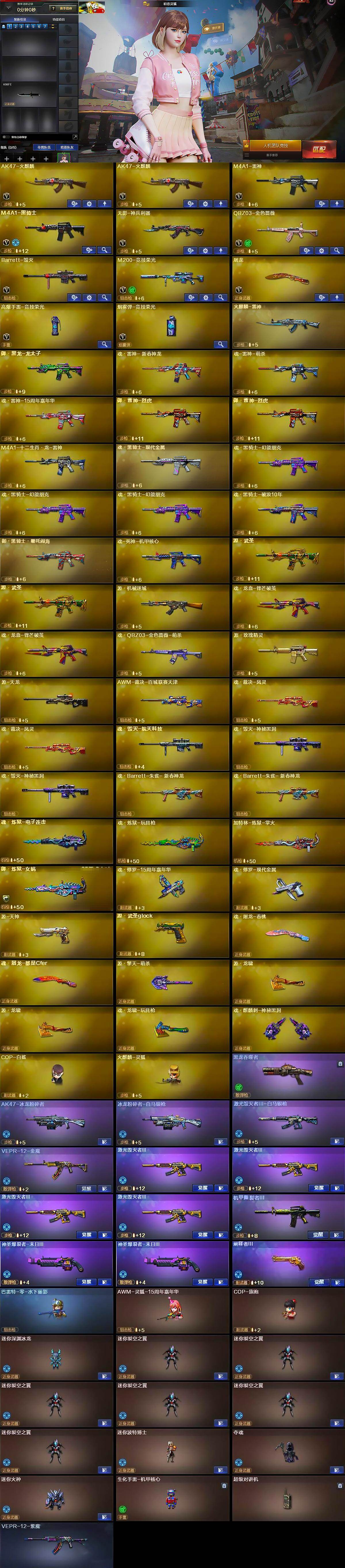 【源级武器】:火麒麟-雷神,御·黑龙-龙太子,魂·雷神-新春神龙,魂-雷神-萌杀,魂·雷神-15周年嘉年华,御·雷神-机甲刑天,御·雷神-烈虎*2,M4A1-十二生肖·龙-雷神,魂·黑骑士-现代金属,魂·黑骑士-幻能朋克*3,魂·黑骑士-破浪10年,御·黑骑士·哪吒闹海,魂-死神-机甲核心,源·武圣*2,源·机械迷城,魂·龙血-锋芒破茧*2,源·青龙,魂·QBZ03-金色蔷薇-萌杀,源·玫瑰精灵,源·天龙,AWM-裁决-百城联赛天津,魂·裁决-凤灵*2,源·毁灭,魂·毁灭-航天科技,魂·毁灭-青帝*2,魂·毁灭-神秘黑洞*2,御·毁灭-黑大圣,魂·Barrett-朱雀- 新春神龙*2,魂·炼狱-电子连击,魂·炼狱-玩具枪,加特林-炼狱-掌火,御·炼狱-女娲,魂·修罗-15周年嘉年华,魂·修罗-现代金属,源·天神,源·武圣g