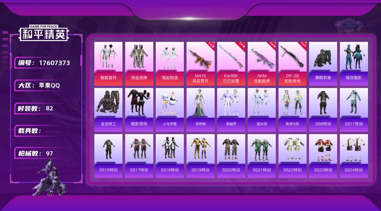 [17607373]苹果 手Q-3粉装-4特效枪-0载具-0粉色飞行器-33345热力值-13王牌印记-82套装-97枪皮 【热门品类】:套装-金羽特工,套装-暗影哥特 【粉色套装】:粉装-智能音符,粉装-绚金战神,粉装-海盐物语 【粉色枪皮等级】:AKM-炫紫旋律(四级),M416-风花雪月(五级),Kar98K-巳巳如意(五级),DP-28-豹影疾电(一级) 【粉色枪皮】:AKM-炫紫旋律,M416-风花雪月,Kar98K-巳巳如意,DP-28-豹影疾电 【粉色降落伞】:垂柳戏鸭降落伞 【稀有套装】:套装-小鸟芋圆,角色-海琴烟,套装-紫幽梦,套装-蓝冰羽,套装-极速光影 【稀有枪皮】:AKM-破晓战魂,AKM-萌趣颜团子,AKM-虎虎生威,AKM-龙的传人,M16A4-幻世战舞者,SCAR-L-暗夜玫瑰,SCAR-L-玉兔迎春,SCAR-L-红色方程式,SCAR-L-黄金龙骨,M416-糯团青竹,M416-红色方程式,M416-蓝色火焰,GROZA-影袭,GROZA-生命誓言,AUG-青春冒险家,QBZ-飞驰魅影,M762-天降萌叽,M762-奇异狩猎者,M762-彩虹符号,M762-牛气冲天,M762-瑞龙福将,蜜獾-娇憨猪猪,UZI-娇憨猪猪,UZI-炫彩节奏,UMP45-夜灯,UMP45-诡娃娃,Vector-治愈之星,Vector-生命誓言,汤姆逊-天降萌叽,P90-飞驰魅影,Kar98K-2B战斗服款,Kar98K-炫彩节奏,Kar98K-飞驰魅影,M24-影袭,AWM-垂柳戏鸭,Mk14-童趣迷兔,Win94-瑞龙福将,SLR-娇憨猪猪,M417-惊鸿侠骨,M200-惊鸿侠骨,S1897-炫彩节奏,S1897-百万伏特,S1897-飞驰魅影,S12K-瑞龙福将,S12K-娇憨猪猪,S12K-幻世战舞者,DBS-时空追击者,AA12-G-炫光之旅,MG3-幻世战舞者,MG3-惊鸿侠骨,MG3-瑞龙福将,爆炸猎弓-惊鸿侠骨,爆炸猎弓-圣斗士星矢,燃烧瓶-甜梦桃焰 【其他套装】:套装-SS6特训,套装-SS11特训,套装-SS15特训,套装-SS17特训,套装-SS18特训,套装-SS19特训,套装-SS20特训,套装-SS21特训,套装-SS22特训,套装-SS23特训,套装-SS24特训,套装-SS25特训,套装-SS26特训,套装-SS28特训,套装-SS29特训,