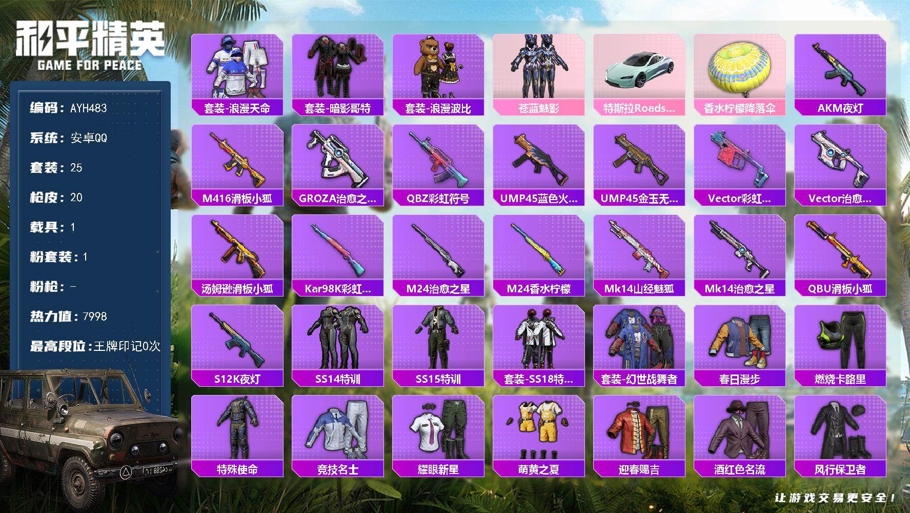 [17607478]安卓 手Q-1粉装-0特效枪-1载具-0粉色飞行器-7998热力值-1王牌印记-25套装-20枪皮 【热门品类】:套装-浪漫天命,套装-暗影哥特,套装-浪漫波比 【粉色套装】:粉装-苍蓝魅影 【粉色载具】:特斯拉Roadster(水滴蓝) 【粉色降落伞】:香水柠檬降落伞 【稀有枪皮】:AKM-夜灯,M416-滑板小狐,GROZA-治愈之星,QBZ-彩虹符号,UMP45-蓝色火焰,UMP45-金玉无双,Vector-彩虹符号,Vector-治愈之星,汤姆逊-滑板小狐,Kar98K-彩虹符号,M24-治愈之星,M24-香水柠檬,Mk14-山经魅狐,Mk14-治愈之星,QBU-滑板小狐,S12K-夜灯 【其他套装】:套装-SS14特训,套装-SS15特训,套装-SS18特训,套装-幻世战舞者,套装-春日漫步,套装-暗影哥特,套装-浪漫天命,套装-燃烧卡路里,套装-特殊使命,套装-竞技名士,套装-耀眼新星,套装-萌黄之夏,套装-迎春赐吉,套装-酒红色名流,套装-风行保卫者,套装-黄色伏地魔,套装-龙腾端午,套装-浪漫波比,套装-滑板小狐,套装-冰爽海盐,套装-治愈之星,套装-迅捷之星,套装-科技之星 【稀有背包】:梦幻火箭背包(3级),萌熊伴侣背包(3级),萌熊伴侣背包(2级),萌熊伴侣背包(1级) 【营地ID】:758699383