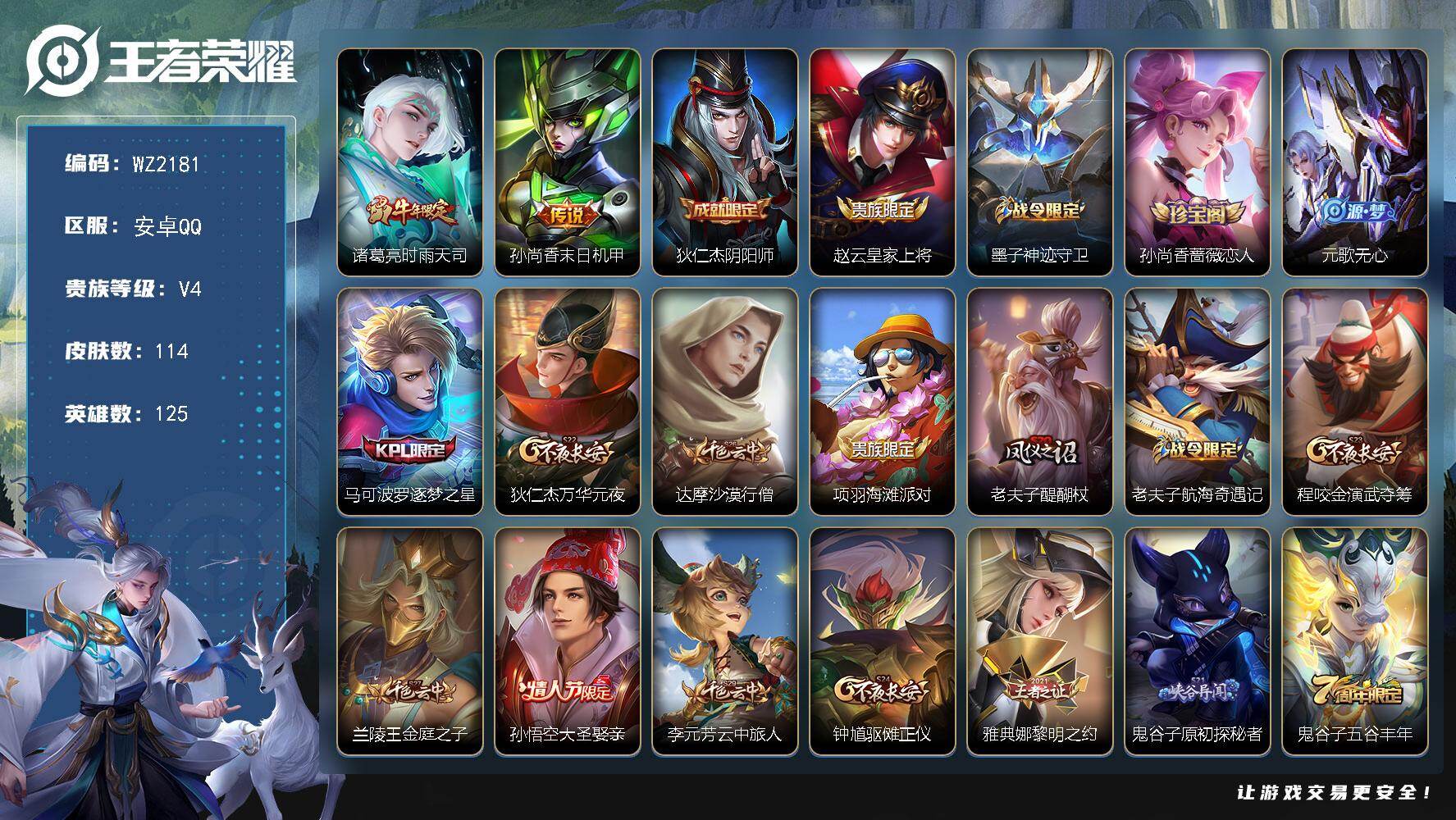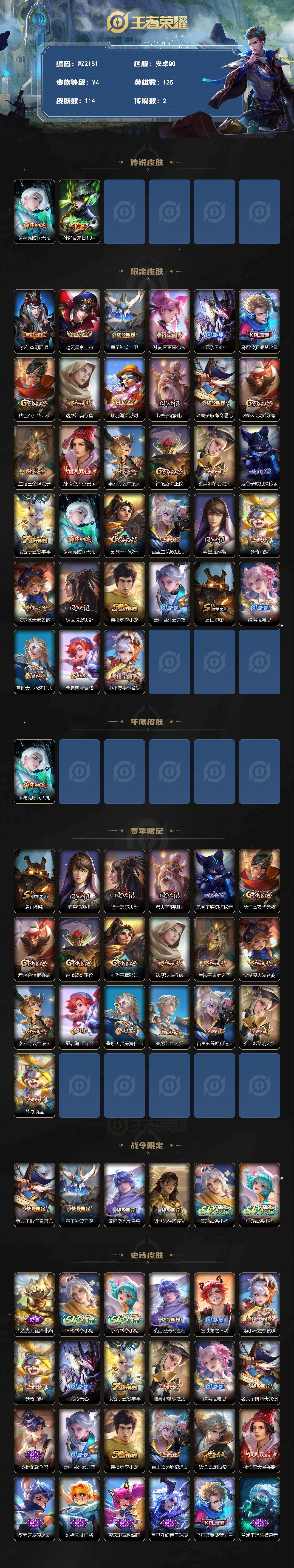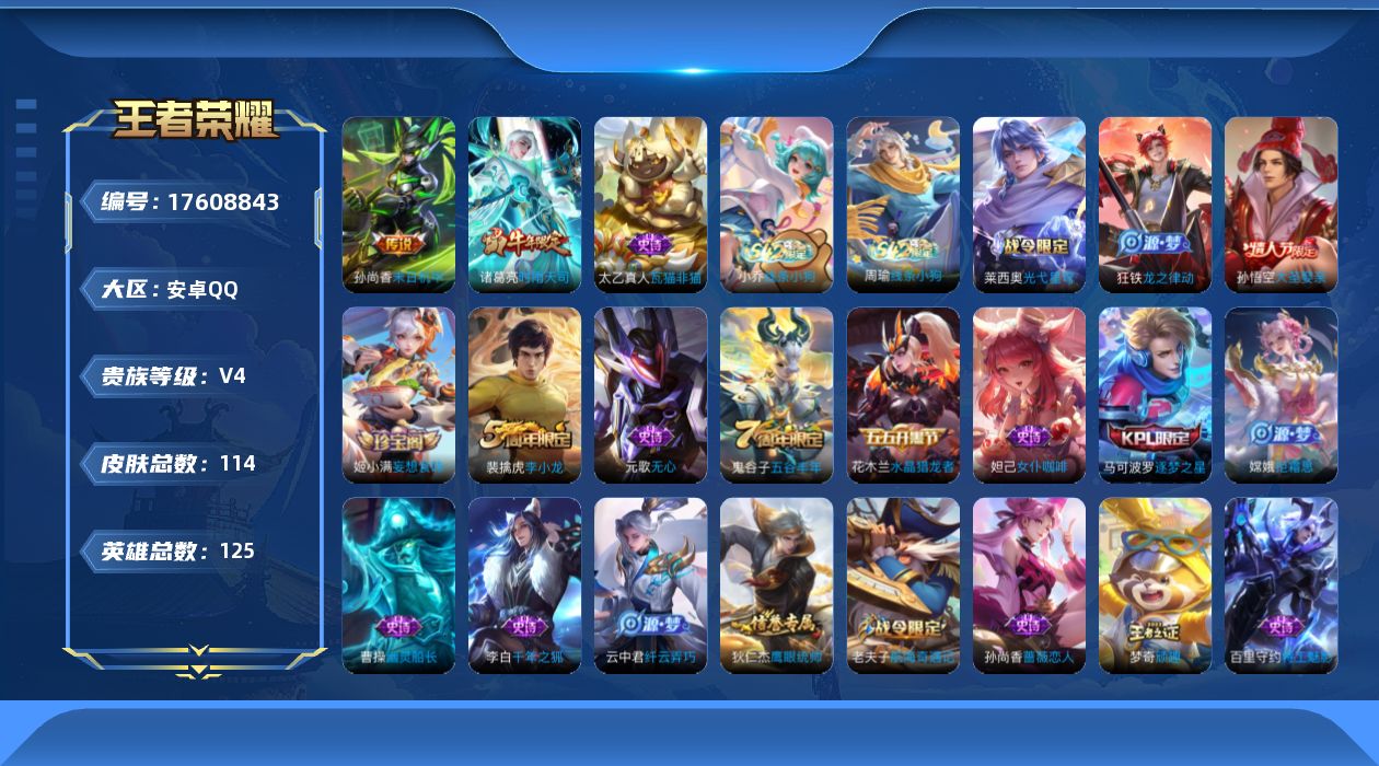 - [12233867]V8 1典藏 2珍品传说 14传说 125英雄 252皮肤 可修改实名 优质装备:弑枪猎影(韩信典藏),朽木白哉,黑崎一护,末日机甲-孙尚香(绿蚂蚱),地狱火,超时空战士-狄仁杰,山海·炽霜斩(李信年限),涂山容容 传说皮:云诺千山,幻光神枪 珍宝阁皮:胡桃夹子,女武神 限定皮:愿照·九州拓(澜年限),鸣野蒿,至尊宝,凤求凰(白切鸡),梅西,武陵仙君(小桃花),飞衡(韩信年限),诗剑行,怒海麟威,冰锋战神,逐梦之影,永曜之星,辉光之辰,大圣娶亲,美猴王 史诗皮:鸭鸭历险记-刘禅,星界战将,龙之律动,石田雨龙,茶境仙,怒海争锋,战舞者,蔬乡物语(鲁班七号),百相守梦-黄忠,紫霞仙子,白龙吟,黄金分割率,千年之狐,江河有灵,末日机甲-莱西奥,魅语,百解令(蒙犽),蒙恬荣光圣徽,偶像歌手,晚萤,电玩·爆裂旋风,龙骑士(小龙虾),末日机甲-吕布,猫狗日记-孙策,乱世虎臣,节奏热浪,女仆咖啡,摇滚巨星,水果甜心,绅士熊喵,天才门将,星夜王子,功夫厨神,德古拉伯爵,暗隐猎兽者,幽灵船长,鬼剑武藏,心灵战警,缤纷独角兽,乘风破浪,逐浪之夏,月团寄思,水晶猎龙者,曙光守护者,箭羽风息,金属风暴,原初追逐者,圣诞狂欢,圣诞恋歌,鹰眼统帅,暗夜贵公子,魅力维加斯,未来纪元-赵云