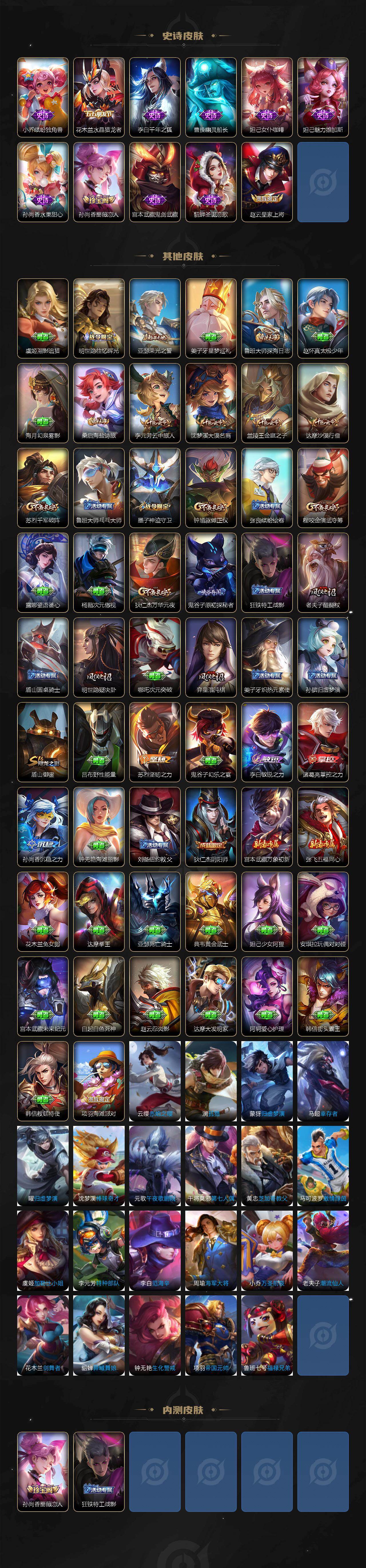 【史诗皮肤】:太乙真人瓦猫非猫,周瑜线条小狗,小乔线条小狗,莱西奥光弋星穹,狂铁龙之律动,姬小满妄想食味,梦奇顽趣,元歌无心,鬼谷子五谷丰年,雅典娜黎明之约,嫦娥拒霜思,老夫子航海奇遇记,蒙犽龙鼓争鸣,云中君纤云弄巧,裴擒虎李小龙,百里玄策原初追逐者,狄仁杰鹰眼统帅,孙悟空大圣娶亲,李元芳逐浪之夏,刘禅天才门将,蔡文姬舞动绿茵,百里守约特工魅影,马可波罗逐梦之星,兰陵王暗隐猎兽者,小乔缤纷独角兽,花木兰水晶猎龙者,李白千年之狐,曹操幽灵船长,妲己女仆咖啡,妲己魅力维加斯,孙尚香水果甜心,孙尚香蔷薇恋人,宫本武藏鬼剑武藏,貂蝉圣诞恋歌,赵云皇家上将