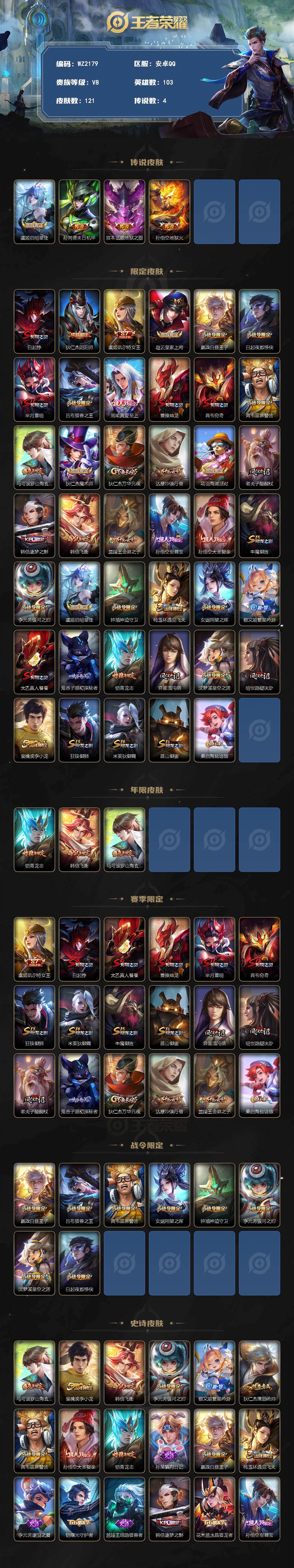 - [17302729]保证金商家 安全第一 找回包赔苹果Q-V8-最强王者段位-126英雄-240皮肤-2典藏皮肤-12传说-49史诗【荣耀典藏】:孙悟空全息碎影,诸葛亮星域神启【传说皮肤】:桑启鸣野蒿,公孙离记忆之芯,虞姬启明星使,刘备时之恋人,干将莫邪久胜战神,虞姬云霓雀翎,达摩黄金狮子座,后羿黄金射手座,貂蝉仲夏夜之梦,孙尚香末日机甲,孙悟空地狱火,狄仁杰超时空战士【限定皮肤】:大乔绒语心约,姜子牙天穹之誓,杨戬破阵退雄兵,狄仁杰阴阳师,赵云皇家上将,嬴政白昼王子,鲁班七号狮舞东方,高渐离玩趣恶龙,芈月重明,芈月白晶晶,吕布猎兽之王,夏侯惇朔风刀,典韦穷奇,狄仁杰魔术师,狄仁杰万华元夜,达摩沙漠行僧,项羽海滩派对,老夫子醍醐杖,程咬金演武夺筹,兰陵王金庭之子,孙悟空孙行者,牛魔御旌,李元芳云中旅人,虞姬启明星使,钟馗神迹守卫,钟馗驱傩正仪,女娲朔望之晖,鬼谷子原初探秘者,苏烈千军破阵,弈星混沌棋,沈梦溪大漠名商,明世隐疑决卦,裴擒虎天狼狩猎者,裴擒虎李小龙,裴擒虎擒涛扼浪,狂铁御狮,米莱狄御霄,云中君纤云弄巧,盾山御銮,上官婉儿梁祝,西施玲珑珍味,鲁班大师探海日志,桑启海盐诗旅,戈娅驭风魔法,艾琳流音漫舞,司空震地狱燃心,张良古海寻踪,蒙犽百解令,鬼谷子天穹祈灯,刘邦剑破天穹,程咬金群星魔术团,镜青焰无极,项羽苍威无极,周瑜熔金海岸 【赛季限定】:芈月重明,夏侯惇朔风刀,典韦穷奇,狄仁杰万华元夜,达摩沙漠行僧,老夫子醍醐杖,程咬金演武夺筹,兰陵王金庭之子,张良古海寻踪,牛魔御旌,李元芳云中旅人,钟馗驱傩正仪,鬼谷子原初探秘者,苏烈千军破阵,弈星混沌棋,沈梦溪大漠名商,明世隐疑决卦,裴擒虎擒涛扼浪,狂铁御狮,米莱狄御霄,盾山御銮,鲁班大师探海日志,桑启海盐诗旅,鬼谷子天穹祈灯,刘邦剑破天穹,姜子牙天穹之誓 【战令限定】:嬴政白昼王子,鲁班七号狮舞东方,吕布猎兽之王,艾琳流音漫舞,钟馗神迹守卫,女娲朔望之晖,西施玲珑珍味,司空震地狱燃心,戈娅驭风魔法,镜青焰无极,项羽苍威无极 【史诗皮肤】:赵云皇家上将,赵云未来纪元,甄姬冰雪圆舞曲,王昭君偶像歌手,狄仁杰魔术师,廉颇地狱岩魂,宫本武藏鬼剑武藏,孙尚香水果甜心,妲己魅力维加斯,刘禅绅士熊喵,曹操幽灵船长,李白千年之狐,吕布末日机甲,张飞乱世虎臣,花木兰水晶猎龙者,夏侯惇乘风破浪,小乔缤纷独角兽,兰陵王暗隐猎兽者,诸葛亮黄金分割率,亚瑟