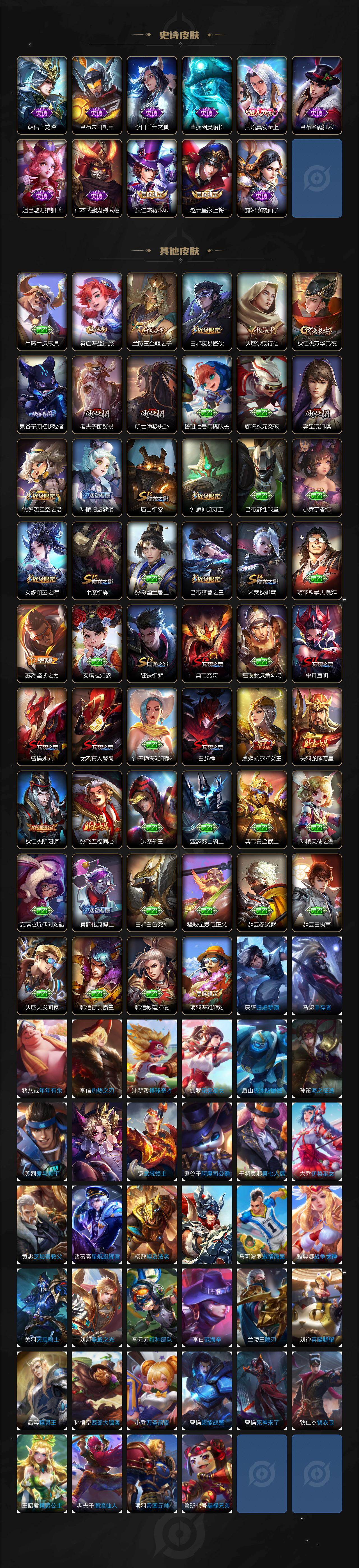 【史诗皮肤】:马可波罗山海玄木吟,裴擒虎李小龙,韩信飞衡,李元芳银河之约,蔡文姬繁星吟游,狄仁杰鹰眼统帅,典韦蓝屏警告,孙悟空大圣娶亲,铠青龙志,孙策猫狗日记,嬴政白昼王子,杨玉环遇见飞天,李元芳逐浪之夏,铠曙光守护者,兰陵王暗隐猎兽者,韩信逐梦之影,花木兰水晶猎龙者,孙悟空至尊宝,韩信白龙吟,吕布末日机甲,李白千年之狐,曹操幽灵船长,周瑜真爱至上,吕布圣诞狂欢,妲己魅力维加斯,宫本武藏鬼剑武藏,狄仁杰魔术师,赵云皇家上将,露娜紫霞仙子