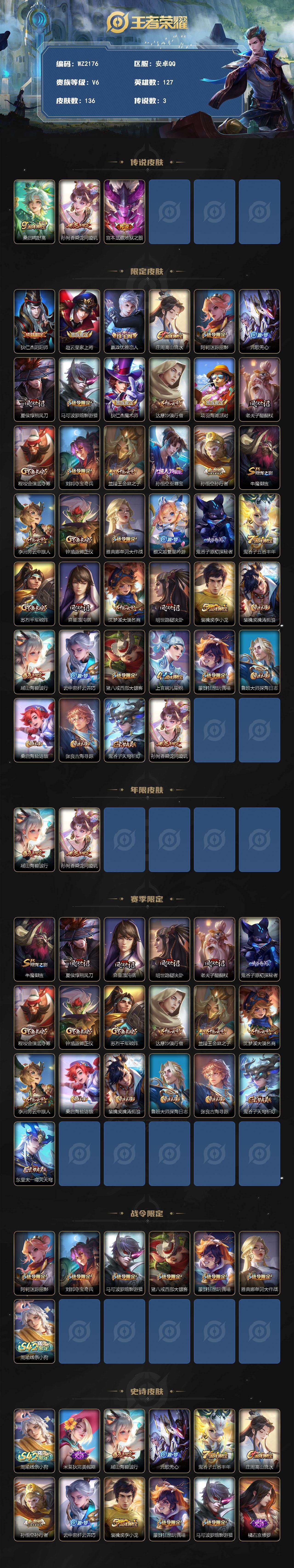 【限定皮肤】:狄仁杰阴阳师,赵云皇家上将,嬴政优雅恋人,庄周高山流水,阿轲迷踪丽影,元歌无心,夏侯惇朔风刀,马可波罗暗影游猎,狄仁杰魔术师,达摩沙漠行僧,项羽海滩派对,老夫子醍醐杖,程咬金演武夺筹,刘邦夺宝奇兵,兰陵王金庭之子,孙悟空至尊宝,孙悟空孙行者,牛魔御旌,李元芳云中旅人,钟馗驱傩正仪,雅典娜单词大作战,蔡文姬繁星吟游,鬼谷子原初探秘者,鬼谷子五谷丰年,苏烈千军破阵,弈星混沌棋,沈梦溪大漠名商,明世隐疑决卦,裴擒虎李小龙,裴擒虎擒涛扼浪,瑶山海碧波行,云中君纤云弄巧,猪八戒西部大镖客,上官婉儿梁祝,蒙犽狂想玩偶喵,鲁班大师探海日志,桑启海盐诗旅,张良古海寻踪,鬼谷子天穹祈灯,孙尚香乘龙问璇玑