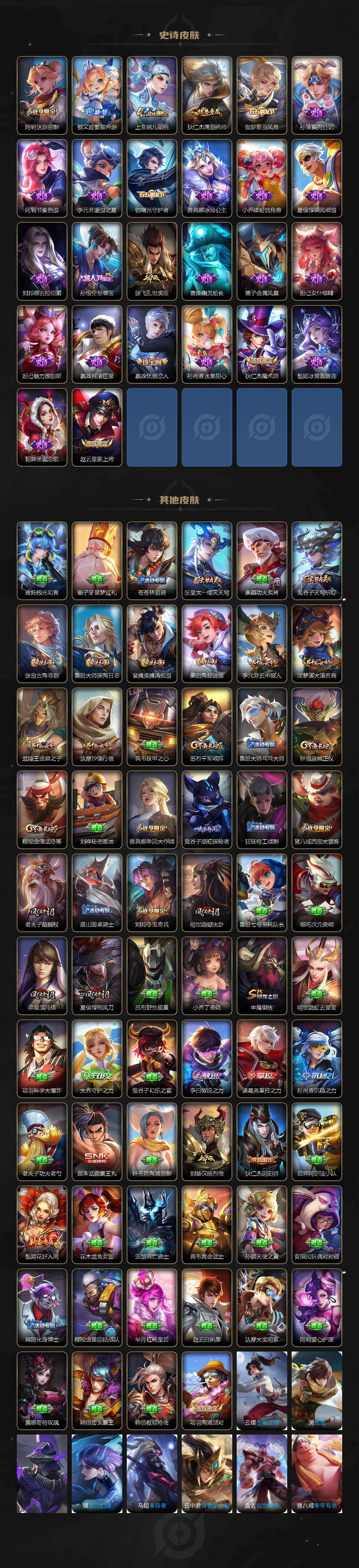 【史诗皮肤】:周瑜线条小狗,米莱狄完美假期,瑶山海碧波行,元歌无心,鬼谷子五谷丰年,庄周高山流水,孙悟空孙行者,云中君纤云弄巧,裴擒虎李小龙,蒙犽狂想玩偶喵,马可波罗暗影游猎,橘右京修罗,阿轲迷踪丽影,蔡文姬繁星吟游,上官婉儿梁祝,狄仁杰鹰眼统帅,伽罗箭羽风息,孙策猫狗日记,阿轲节奏热浪,李元芳逐浪之夏,铠曙光守护者,雅典娜冰冠公主,小乔缤纷独角兽,夏侯惇乘风破浪,刘邦德古拉伯爵,孙悟空至尊宝,张飞乱世虎臣,曹操幽灵船长,墨子金属风暴,妲己女仆咖啡,妲己魅力维加斯,嬴政摇滚巨星,嬴政优雅恋人,孙尚香水果甜心,狄仁杰魔术师,甄姬冰雪圆舞曲,貂蝉圣诞恋歌,赵云皇家上将