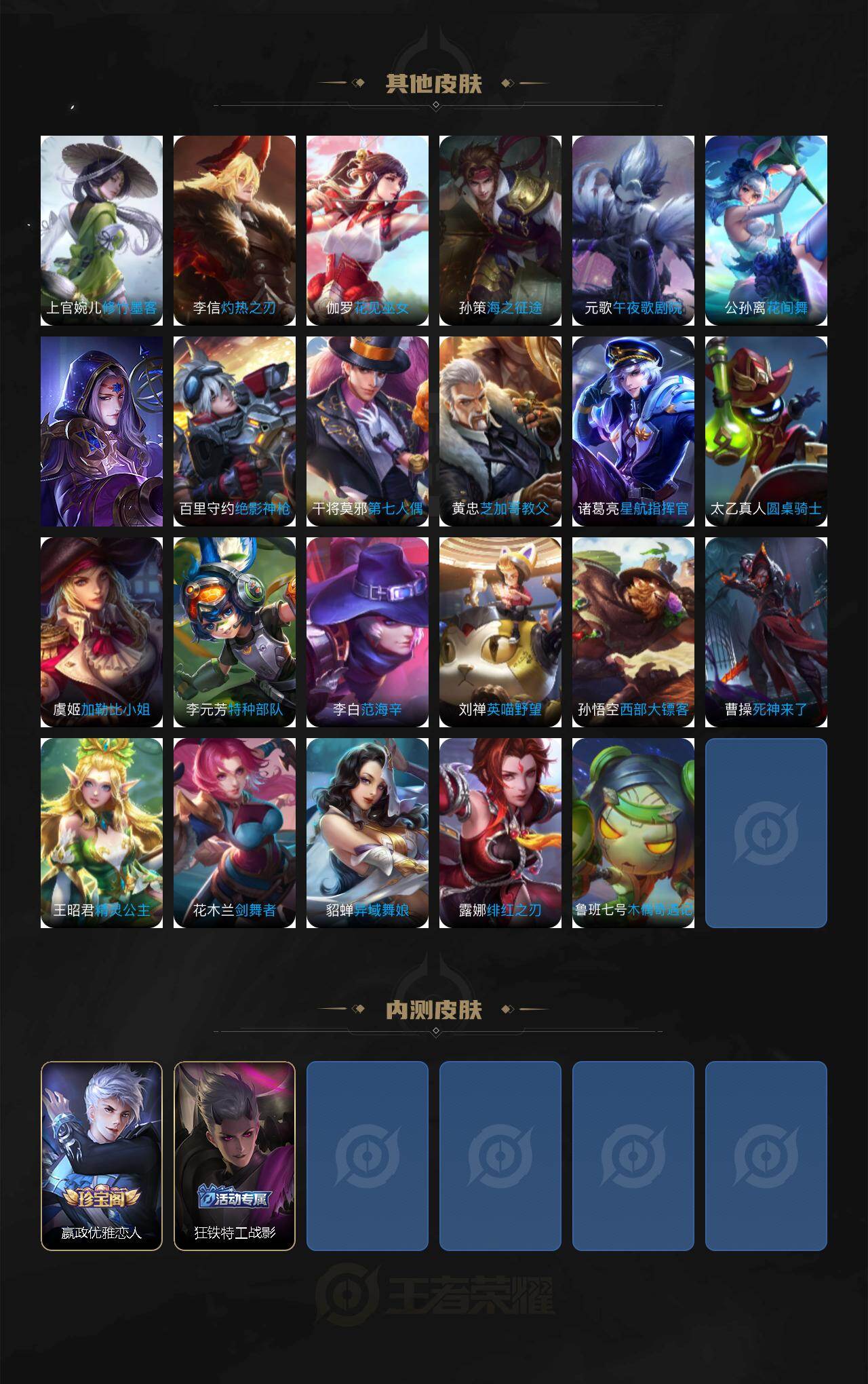 【赛季限定】:牛魔御旌,夏侯惇朔风刀,弈星混沌棋,明世隐疑决卦,老夫子醍醐杖,鬼谷子原初探秘者,程咬金演武夺筹,钟馗驱傩正仪,苏烈千军破阵,达摩沙漠行僧,兰陵王金庭之子,沈梦溪大漠名商,李元芳云中旅人,桑启海盐诗旅,裴擒虎擒涛扼浪,鲁班大师探海日志,张良古海寻踪,鬼谷子天穹祈灯,东皇太一噬灭天穹