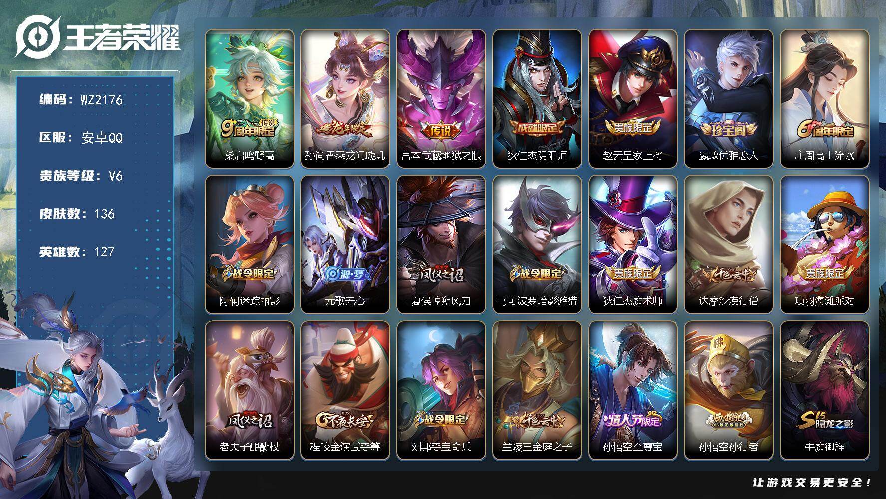 [17609075]安卓Q-136皮肤-3传说-37史诗 【传说皮肤】:桑启鸣野蒿,孙尚香乘龙问璇玑,宫本武藏地狱之眼 【限定皮肤】:狄仁杰阴阳师,赵云皇家上将,嬴政优雅恋人,庄周高山流水,阿轲迷踪丽影,元歌无心,夏侯惇朔风刀,马可波罗暗影游猎,狄仁杰魔术师,达摩沙漠行僧,项羽海滩派对,老夫子醍醐杖,程咬金演武夺筹,刘邦夺宝奇兵,兰陵王金庭之子,孙悟空至尊宝,孙悟空孙行者,牛魔御旌,李元芳云中旅人,钟馗驱傩正仪,雅典娜单词大作战,蔡文姬繁星吟游,鬼谷子原初探秘者,鬼谷子五谷丰年,苏烈千军破阵,弈星混沌棋,沈梦溪大漠名商,明世隐疑决卦,裴擒虎李小龙,裴擒虎擒涛扼浪,瑶山海碧波行,云中君纤云弄巧,猪八戒西部大镖客,上官婉儿梁祝,蒙犽狂想玩偶喵,鲁班大师探海日志,桑启海盐诗旅,张良古海寻踪,鬼谷子天穹祈灯,孙尚香乘龙问璇玑 【年限皮肤】:瑶山海碧波行,孙尚香乘龙问璇玑 【赛季限定】:牛魔御旌,夏侯惇朔风刀,弈星混沌棋,明世隐疑决卦,老夫子醍醐杖,鬼谷子原初探秘者,程咬金演武夺筹,钟馗驱傩正仪,苏烈千军破阵,达摩沙漠行僧,兰陵王金庭之子,沈梦溪大漠名商,李元芳云中旅人,桑启海盐诗旅,裴擒虎擒涛扼浪,鲁班大师探海日志,张良古海寻踪,鬼谷子天穹祈灯,东皇太一噬灭天穹 【战令限定】:阿轲迷踪丽影,刘邦夺宝奇兵,马可波罗暗影游猎,猪八戒西部大镖客,蒙犽狂想玩偶喵,雅典娜单词大作战,周瑜线条小狗 【史诗皮肤】:周瑜线条小狗,米莱狄完美假期,瑶山海碧波行,元歌无心,鬼谷子五谷丰年,庄周高山流水,孙悟空孙行者,云中君纤云弄巧,裴擒虎李小龙,蒙犽狂想玩偶喵,马可波罗暗影游猎,橘右京修罗,阿轲迷踪丽影,蔡文姬繁星吟游,上官婉儿梁祝,狄仁杰鹰眼统帅,伽罗箭羽风息,孙策猫狗日记,阿轲节奏热浪,李元芳逐浪之夏,铠曙光守护者,雅典娜冰冠公主,小乔缤纷独角兽,夏侯惇乘风破浪,刘邦德古拉伯爵,孙悟空至尊宝,张飞乱世虎臣,曹操幽灵船长,墨子金属风暴,妲己女仆咖啡,妲己魅力维加斯,嬴政摇滚巨星,嬴政优雅恋人,孙尚香水果甜心,狄仁杰魔术师,甄姬冰雪圆舞曲,貂蝉圣诞恋歌,赵云皇家上将 【其他皮肤】:蚩奼极光幻客,姜子牙星梦巡礼,苍苍林狼骑,东皇太一噬灭天穹,廉颇功夫炙烤,鬼谷子天穹祈灯,张良古海寻踪,鲁班大师探海日志,裴擒虎擒涛扼浪,桑启海盐诗旅,李元芳云中旅人,沈梦溪大漠名商,兰陵王金庭之子,达摩沙漠行僧,典韦铁甲之心,苏烈千