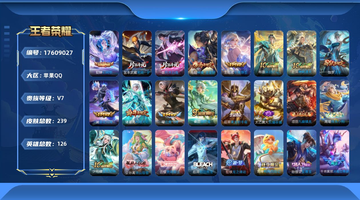 [17609027]苹果Q-239皮肤-1典藏皮肤-2珍品传说-10传说-75史诗 【英雄全皮】:孙权全皮,空空儿全皮 【荣耀典藏】:貂蝉幻阙歌 【珍品传说】:宫本武藏黑崎一护,暃朽木白哉 【传说皮肤】:马超神骥逐星野,王昭君长夜焕生,杨戬纵目迁山,后羿神树通天,桑启鸣野蒿,澜逐花归海,诸葛亮时雨天司,曜云鹰飞将,伽罗太华,后羿黄金射手座 【限定皮肤】:白起狰,姜子牙天穹之誓,狄仁杰阴阳师,虞姬凯尔特女王,赵云皇家上将,赵云引擎之心,嬴政白昼王子,孙尚香蔷薇恋人,鲁班七号狮舞东方,庄周高山流水,高渐离玩趣恶龙,钟无艳王者之锤,芈月重明,吕布猎兽之王,元歌云间偶戏,元歌无心,夏侯惇朔风刀,曹操烛龙,典韦穷奇,马可波罗暗影游猎,狄仁杰魔术师,狄仁杰万华元夜,达摩沙漠行僧,项羽海滩派对,老夫子醍醐杖,程咬金演武夺筹,韩信飞衡,兰陵王金庭之子,亚瑟潮玩骑士王,孙悟空至尊宝,孙悟空大圣娶亲,牛魔御旌,李元芳云中旅人,钟馗神迹守卫,钟馗驱傩正仪,女娲朔望之晖,干将莫邪冰霜恋舞曲,雅典娜单词大作战,雅典娜黎明之约,太乙真人饕餮,鬼谷子原初探秘者,鬼谷子五谷丰年,诸葛亮时雨天司,苏烈千军破阵,百里玄策原初追逐者,百里守约朱雀志,弈星混沌棋,梦奇顽趣,沈梦溪大漠名商,明世隐疑决卦,裴擒虎天狼狩猎者,裴擒虎李小龙,裴擒虎擒涛扼浪,狂铁御狮,米莱狄御霄,云中君纤云弄巧,伽罗太华,盾山御銮,猪八戒西部大镖客,上官婉儿梁祝,嫦娥拒霜思,蒙犽狂想玩偶喵,鲁班大师探海日志,桑启海盐诗旅,张良古海寻踪,蒙恬荣光圣徽,鬼谷子天穹祈灯 【年限皮肤】:百里守约朱雀志,伽罗太华,韩信飞衡,诸葛亮时雨天司 【赛季限定】:虞姬凯尔特女王,白起狰,太乙真人饕餮,曹操烛龙,芈月重明,典韦穷奇,狂铁御狮,米莱狄御霄,牛魔御旌,盾山御銮,夏侯惇朔风刀,弈星混沌棋,明世隐疑决卦,老夫子醍醐杖,鬼谷子原初探秘者,狄仁杰万华元夜,程咬金演武夺筹,钟馗驱傩正仪,苏烈千军破阵,达摩沙漠行僧,兰陵王金庭之子,沈梦溪大漠名商,李元芳云中旅人,桑启海盐诗旅,裴擒虎擒涛扼浪,鲁班大师探海日志,张良古海寻踪,鬼谷子天穹祈灯,姜子牙天穹之誓,东皇太一噬灭天穹,太乙真人谧流熔炉,钟馗虚灵犬护,甄姬逆浪荇歌,亚瑟荣光之誓,百里玄策原初追逐者,雅典娜黎明之约,梦奇顽趣,蒙恬荣光圣徽,牛魔星界战将,项羽九幽镇关 【战令限定】:嬴政白昼王子,吕布猎兽之王,女娲朔望之