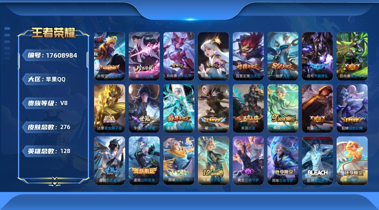 [17608984]苹果Q-276皮肤-1典藏皮肤-1珍品传说-14传说-85史诗 【英雄全皮】:孙权全皮,影全皮 【荣耀典藏】:孙悟空全息碎影 【珍品传说】:暃朽木白哉 【传说皮肤】:桑启鸣野蒿,诸葛亮时雨天司,虞姬启明星使,关羽武圣,曜云鹰飞将,李信一念神魔,刘备时之恋人,伽罗太华,貂蝉猫影幻舞,虞姬云霓雀翎,达摩黄金狮子座,百里玄策白虎志,孙尚香末日机甲,吕布天魔缭乱 【限定皮肤】:白起狰,狄仁杰阴阳师,虞姬凯尔特女王,赵云皇家上将,赵云龙胆,妲己时之彼端,嬴政白昼王子,鲁班七号狮舞东方,庄周高山流水,高渐离死亡摇滚,阿轲迷踪丽影,白起夜都怪侠,芈月重明,吕布天魔缭乱,吕布猎兽之王,元歌云间偶戏,夏侯惇朔风刀,甄姬游园惊梦,曹操烛龙,典韦穷奇,典韦蓝屏警告,马可波罗暗影游猎,狄仁杰魔术师,狄仁杰万华元夜,达摩星际陆战队,达摩沙漠行僧,项羽海滩派对,老夫子醍醐杖,关羽武圣,程咬金演武夺筹,露娜一生所爱,刘邦夺宝奇兵,韩信逐梦之影,兰陵王金庭之子,亚瑟潮玩骑士王,孙悟空至尊宝,孙悟空大圣娶亲,牛魔御旌,后羿辉光之辰,李元芳银河之约,李元芳云中旅人,虞姬启明星使,钟馗神迹守卫,钟馗驱傩正仪,杨玉环遇见飞天,女娲朔望之晖,干将莫邪冰霜恋舞曲,雅典娜单词大作战,雅典娜黎明之约,蔡文姬繁星吟游,太乙真人饕餮,太乙真人华丽摇滚,鬼谷子原初探秘者,鬼谷子五谷丰年,诸葛亮时雨天司,黄忠烈魂,铠青龙志,苏烈千军破阵,百里玄策白虎志,百里玄策原初追逐者,弈星混沌棋,梦奇顽趣,沈梦溪星空之诺,明世隐疑决卦,明世隐吟游魔法,裴擒虎天狼狩猎者,裴擒虎李小龙,裴擒虎擒涛扼浪,狂铁御狮,米莱狄御霄,米莱狄胡桃异想国,云中君纤云弄巧,伽罗太华,盾山御銮,猪八戒西部大镖客,上官婉儿天狼绘梦者,蒙犽狂想玩偶喵,鲁班大师探海日志,桑启海盐诗旅,艾琳女武神,阿古朵江河有灵,张良古海寻踪,裴擒虎梅西,蒙恬荣光圣徽,鬼谷子天穹祈灯,姬小满妄想食味 【年限皮肤】:后羿辉光之辰,百里玄策白虎志,铠青龙志,伽罗太华,诸葛亮时雨天司 【赛季限定】:虞姬凯尔特女王,白起狰,太乙真人饕餮,曹操烛龙,芈月重明,典韦穷奇,狂铁御狮,米莱狄御霄,牛魔御旌,盾山御銮,夏侯惇朔风刀,弈星混沌棋,明世隐疑决卦,老夫子醍醐杖,鬼谷子原初探秘者,狄仁杰万华元夜,程咬金演武夺筹,钟馗驱傩正仪,苏烈千军破阵,达摩沙漠行僧,兰陵王金庭之子,李元芳云中旅人,