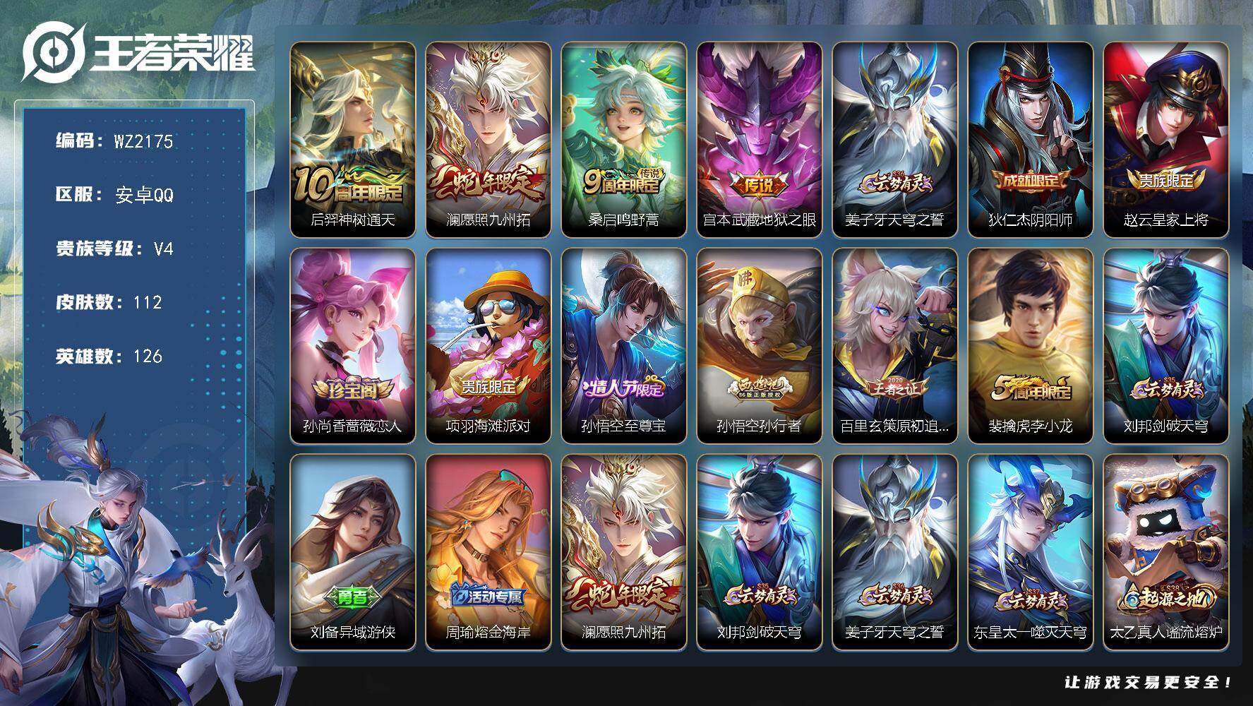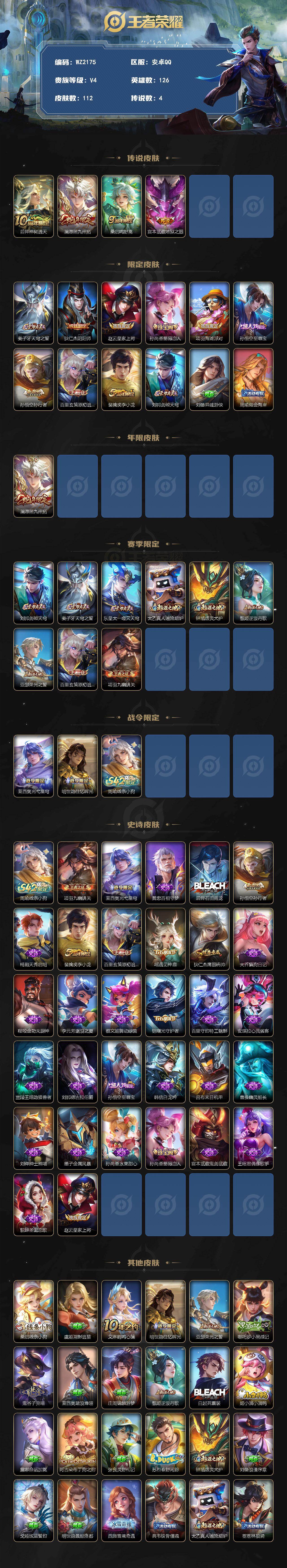 [17609127]安卓Q-112皮肤-4传说-31史诗 【传说皮肤】:后羿神树通天,澜愿照九州拓,桑启鸣野蒿,宫本武藏地狱之眼 【限定皮肤】:姜子牙天穹之誓,狄仁杰阴阳师,赵云皇家上将,孙尚香蔷薇恋人,项羽海滩派对,孙悟空至尊宝,孙悟空孙行者,百里玄策原初追逐者,裴擒虎李小龙,刘邦剑破天穹,刘备异域游侠,周瑜熔金海岸 【年限皮肤】:澜愿照九州拓 【赛季限定】:刘邦剑破天穹,姜子牙天穹之誓,东皇太一噬灭天穹,太乙真人谧流熔炉,钟馗虚灵犬护,甄姬逆浪荇歌,亚瑟荣光之誓,百里玄策原初追逐者,项羽九幽镇关 【战令限定】:莱西奥光弋星穹,明世隐往忆晖光,周瑜线条小狗 【史诗皮肤】:周瑜线条小狗,项羽九幽镇关,莱西奥光弋星穹,黄忠百相守梦,后羿石田雨龙,孙悟空孙行者,杨戬天秀启明,裴擒虎李小龙,百里玄策原初追逐者,瑶遇见神鹿,狄仁杰鹰眼统帅,大乔猫狗日记,程咬金功夫厨神,李元芳逐浪之夏,蔡文姬舞动绿茵,铠曙光守护者,百里守约特工魅影,安琪拉心灵骇客,兰陵王暗隐猎兽者,刘邦德古拉伯爵,孙悟空至尊宝,韩信白龙吟,吕布末日机甲,曹操幽灵船长,刘禅绅士熊喵,墨子金属风暴,孙尚香水果甜心,孙尚香蔷薇恋人,宫本武藏鬼剑武藏,王昭君偶像歌手,貂蝉圣诞恋歌,赵云皇家上将 【其他皮肤】:桑启线条小狗,虞姬溯影追猎,艾琳鹤鸣心笺,明世隐往忆晖光,亚瑟荣光之誓,哪吒罗小黑战记,鬼谷子克喵,莱西奥踏浪烽翎,庄周锦麟游梦,甄姬逆浪荇歌,白起死霸装,姬小满小满鸭,露娜命运加冕,阿古朵布丁狗之约,张良灵野札记,苏烈春野闲踪,钟馗虚灵犬护,刘备浪漫序章,戈娅玫蓝誓约,明世隐景韶洛都,西施雪境奇遇,典韦铁骨偃魂,太乙真人谧流熔炉,苍苍林狼骑,吕布逐霄战戟,干将莫邪雾都夜雨,东皇太一噬灭天穹,盘古敬我三分,周瑜熔金海岸,姜子牙天穹之誓,刘备异域游侠,大司命暗都幽影,刘邦剑破天穹,廉颇功夫炙烤,李元芳妄想特派,猪八戒潮玩探月行,程咬金无双福将,鲁班大师乓乓大师,李白敏锐之力,孙尚香沉稳之力,王昭君幻想奇妙夜,刘备纽约教父,狄仁杰阴阳师,宫本武藏万象初新,亚瑟死亡骑士,典韦黄金武士,妲己少女阿狸,姜子牙时尚教父,安琪拉玩偶对对碰,宫本武藏未来纪元,白起白色死神,程咬金星际陆战队,芈月红桃皇后,赵云忍炎影,达摩大发明家,露娜哥特玫瑰,韩信街头霸王,韩信教廷特使,项羽海滩派对,暃碧珀绯影,澜孤猎,云中君荷鲁斯之眼,盘古创世神祝,李信灼热