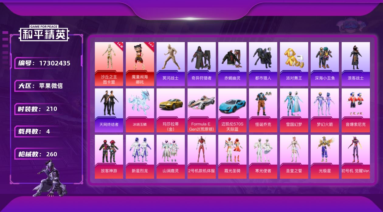[17302435]2套6级红装可随意切换等级【特价出售/店主推荐】苹果 微信-2神装-18粉装-10特效枪-4载具-7粉色飞行器-108548热力值-15王牌印记-210套装-260枪皮