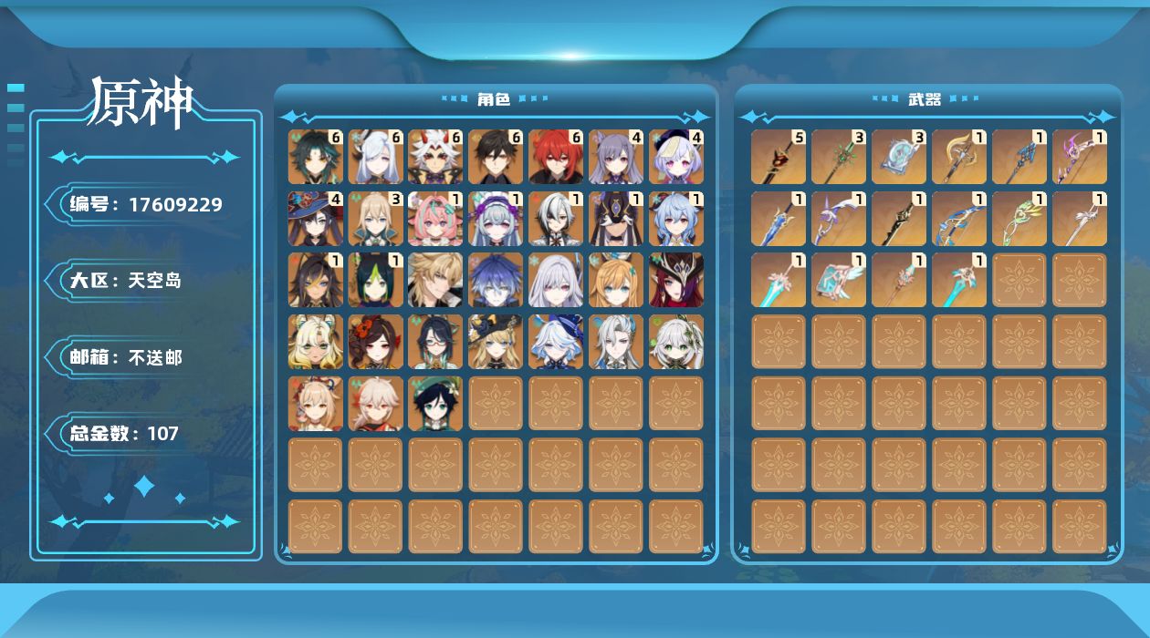 1命阿蕾奇诺,0命千织,0命闲云,0命娜维娅,0命芙宁娜,0命那维莱特,1命迪希雅,0命纳西妲,1命赛诺,1命提纳里,满命申鹤,满命荒泷一斗,0命枫原万叶,满命钟离,1命甘雨,满命魈,0命宵宫,0命温迪,4命刻晴,4命七七,3命琴,4命莫娜,满命迪卢克,0命希诺宁,0命恰斯卡,1命梦见月瑞希,1命瓦雷莎,0命爱可菲,0命丝柯克,0命菲林斯,0命法尔伽,精1裁断,精1猎人之径,精1息灾,精5赤角石溃杵,精1终末嗟叹之诗,精1飞雷之弦振,精1松籁响起之时,精3四风原典,精3和璞鸢,精1天空之脊,精1阿莫斯之弓,精1天空之刃,精1斫峰之刃,精1天空之卷,精1风鹰剑,精1天空之傲