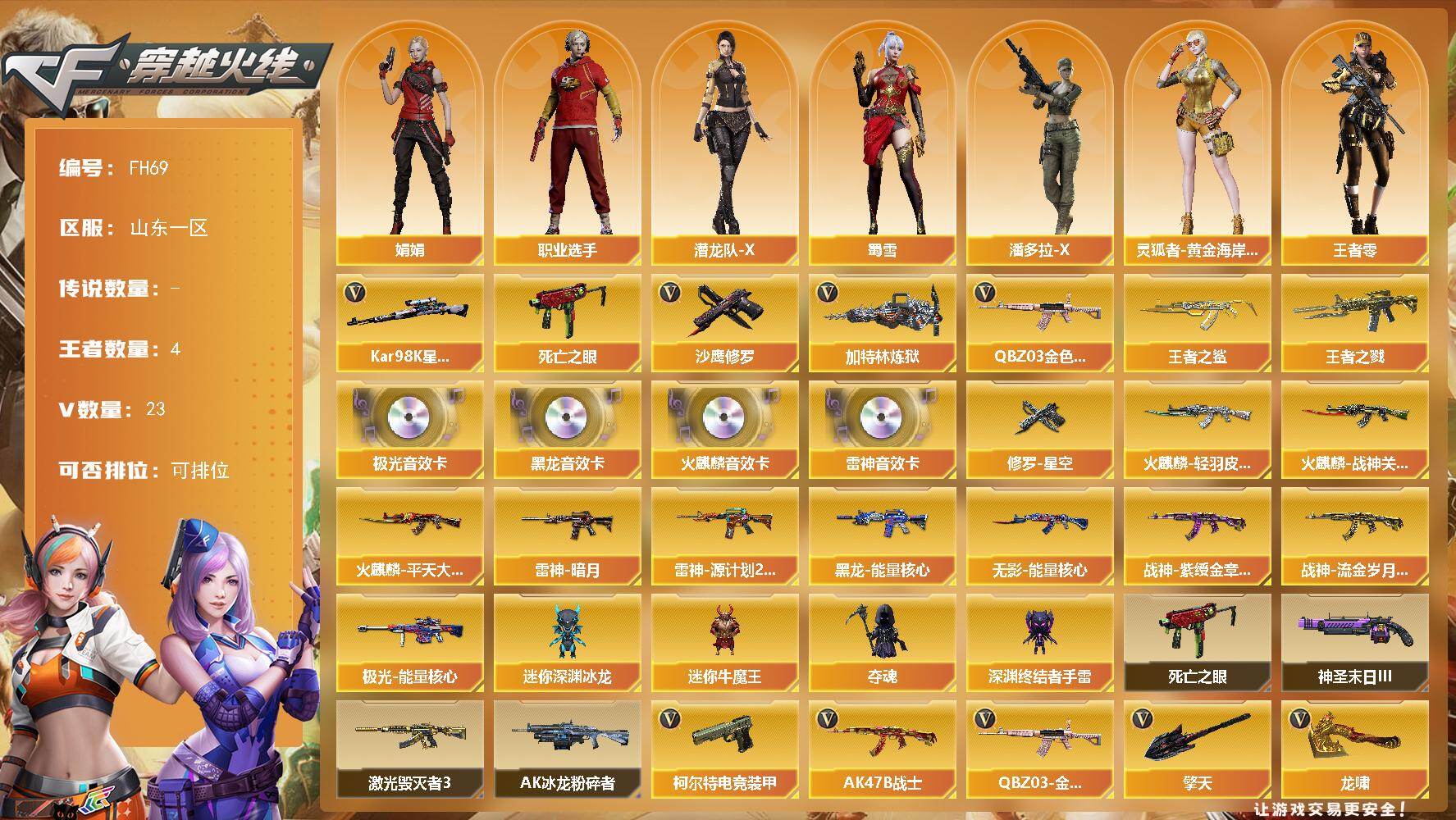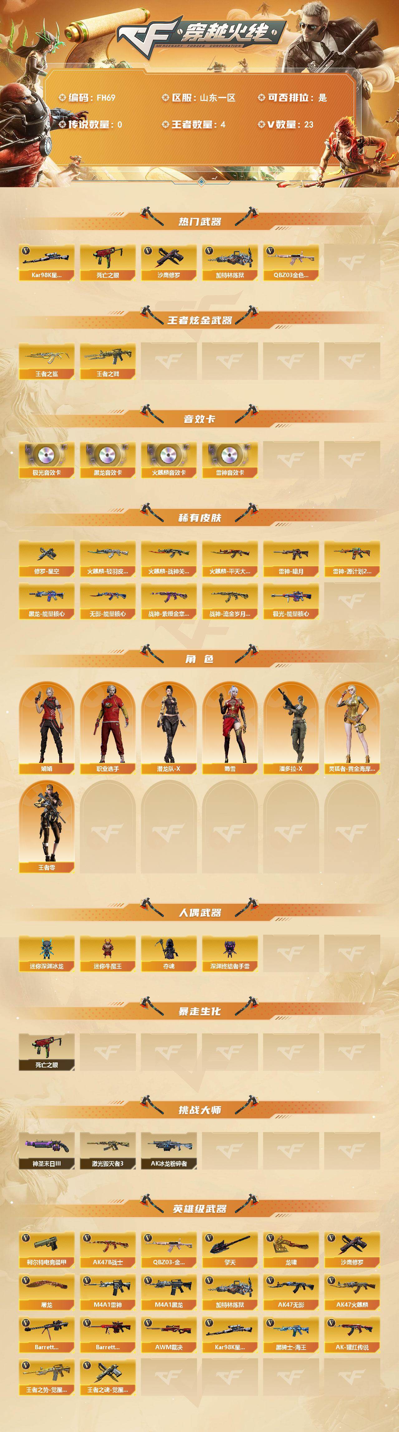 [17610855]山东一区-25V-4王者武器数-0炫金武器数 【热门武器】:QBZ03-金色蔷薇,死亡之眼,Kar98K-星神,加特林-炼狱,沙鹰-修罗 【王者炫金武器】:王者之鲨,王者之戮 【音效卡】:AK47-火麒麟音效卡,M4A1-雷神音效卡,M4A1-黑龙音效卡,Barrett-极光音效卡 【皮肤】:雷神-暗月*2,雷神-源计划2.0专属 皮肤,火麒麟-轻羽皮肤*2,火麒麟-战神关羽,火麒麟-平天大圣,黑龙-能量核心,无影-能量核心,战神-紫绶金章皮肤*3,战神-流金岁月皮肤,极光-能量核心*2,修罗-星空 【角色】:王者-零,娟娟,灵狐者-黄金海岸,潘多拉-X,潜龙队-X,蜀雪,职业选手 【人偶武器】:迷你深渊冰龙,迷你牛魔王,夺魂,深渊终结者手雷 【暴走生化】:死亡之眼 【挑战大师】:AK47-冰龙粉碎者,激光毁灭者III,神圣爆裂者-末日III 【英雄级武器】:AK47-火麒麟,M4A1-黑龙,M4A1-雷神,AK47-无影,QBZ03-金色蔷薇,王者之势-觉醒版,AK-47-猩红传说*3,黑骑士-海王,AK47-B-战士,Barrett-毁灭,Barrett-极光,AWM-裁决,Kar98K-星神,加特林-炼狱,沙鹰-修罗,柯尔特-电竞装甲,王者之魂-觉醒版,屠龙,龙啸,擎天 【源级武器】:源-千变*2,源·火麒麟*3,御·火麒麟-平天大圣,御·黑龙-龙太子,源·雷神*2,M4A1-十二生肖·龙-雷神,雷神-赛博朋克*2,御·雷神-葫芦兄弟,御·雷神-小白龙,源·黑骑士,御·黑骑士·哪吒闹海*3,御·超新星-圣诞*2,源·机械迷城,源·青龙*2,魂·HK417-朱雀-凤灵,魂·QBZ03-金色蔷薇-萌杀,源·天龙,源·毁灭*3,魂·毁灭-青帝,御·毁灭-葫芦兄弟,魂·Barrett-朱雀- 新春神龙,魂·炼狱-玩具枪,御·炼狱-女娲 【道具】:炫彩背包,超级背包,绿色巨人,灵魂忍者,变异宝贝,迷雾幽灵,生化弹匣,夺命之镰,防化服*2,流光-再燃火线,枪王排位28赛季金色流光,防弹头盔*7,防弹衣*5,C4工具钳*4,手雷包*3 【特殊枪械】:1炼狱