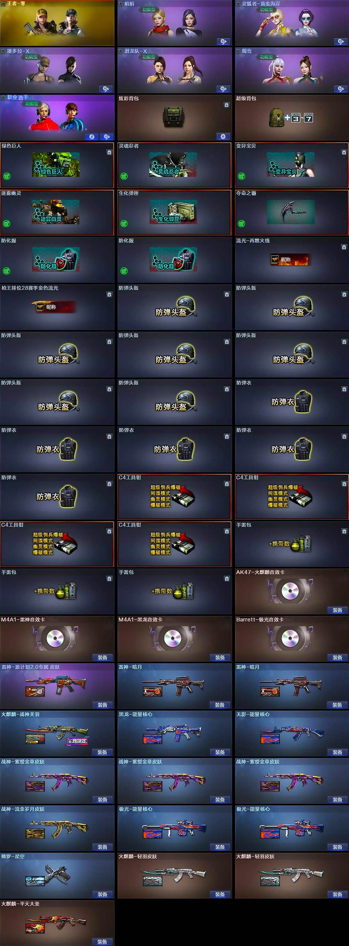 【道具】:炫彩背包,超级背包,绿色巨人,灵魂忍者,变异宝贝,迷雾幽灵,生化弹匣,夺命之镰,防化服*2,流光-再燃火线,枪王排位28赛季金色流光,防弹头盔*7,防弹衣*5,C4工具钳*4,手雷包*3