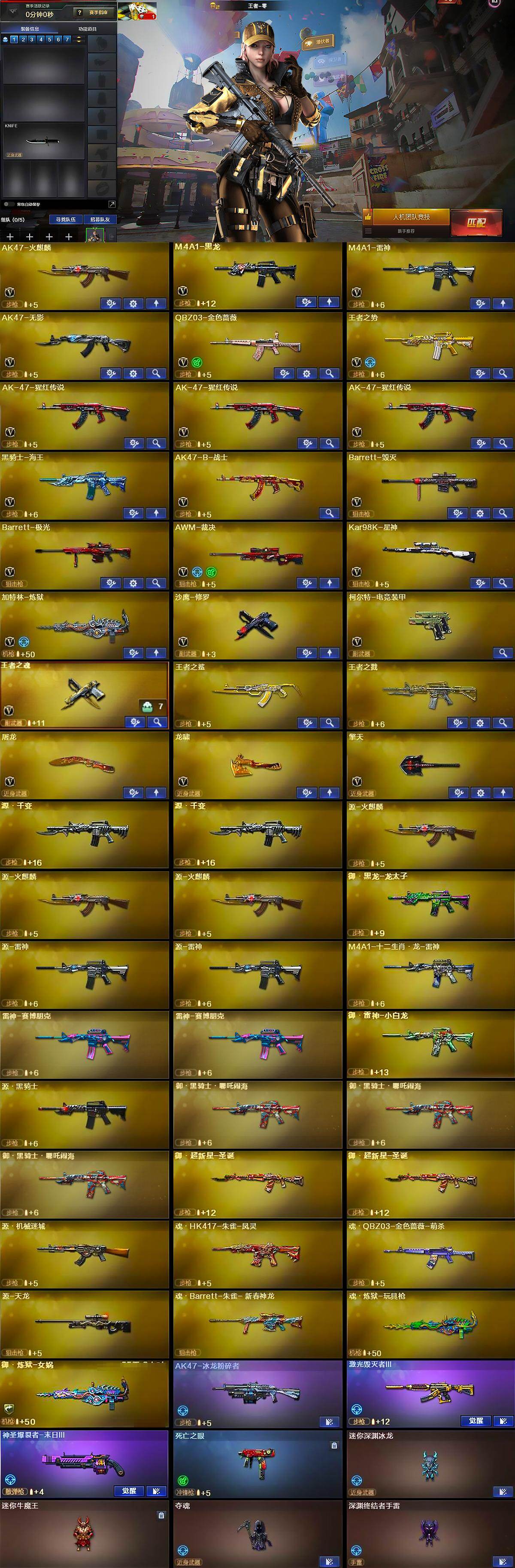 【英雄级武器】:AK47-火麒麟,M4A1-黑龙,M4A1-雷神,AK47-无影,QBZ03-金色蔷薇,王者之势-觉醒版,AK-47-猩红传说*3,黑骑士-海王,AK47-B-战士,Barrett-毁灭,Barrett-极光,AWM-裁决,Kar98K-星神,加特林-炼狱,沙鹰-修罗,柯尔特-电竞装甲,王者之魂-觉醒版,屠龙,龙啸,擎天