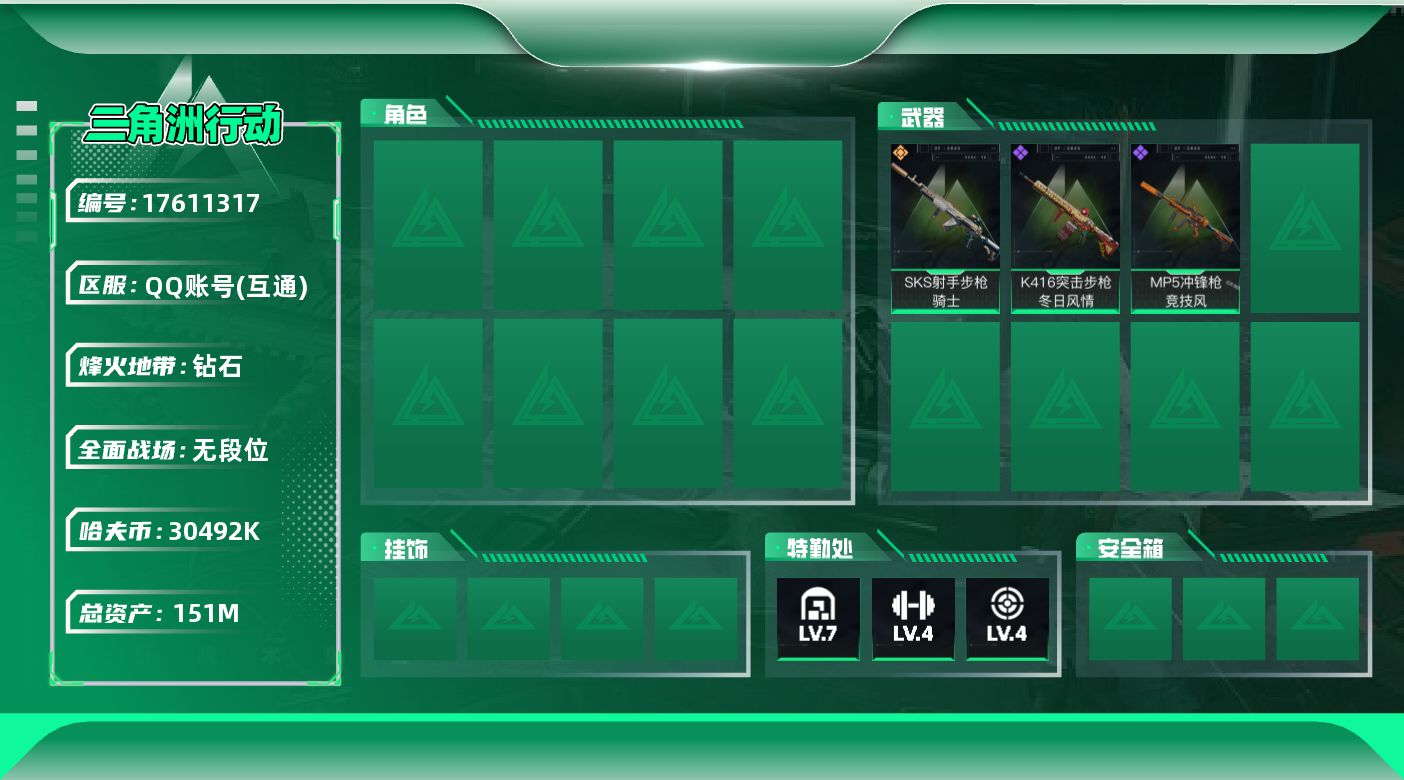 [17611317]【特价出售/店主推荐】151m总资产-30492k哈伏币-60烽火等级-钻石-1战场等级-无军衔 【近战皮肤】:近战-黑鹰 【传说外观】:SKS射手步枪-骑士 【史诗外观】:K416突击步枪-冬日风情,MP5冲锋枪-竞技风 【稀有外观】:AKM突击步枪-肃杀,K416突击步枪-一帆风顺,SG552突击步枪-2026,SMG-45冲锋枪-行动开启,M249轻机枪-冰天雪地 【普通外观】:QBZ95-1突击步枪-2026,勇士冲锋枪-磐石,PKM通用机枪-变色龙,M250通用机枪-雪松,QJB201轻机枪-典雅,PSG-1射手步枪-雪松,G17-2026 【挂饰】:挂饰-暗行哨兵*2,挂饰-紧急撤离*8