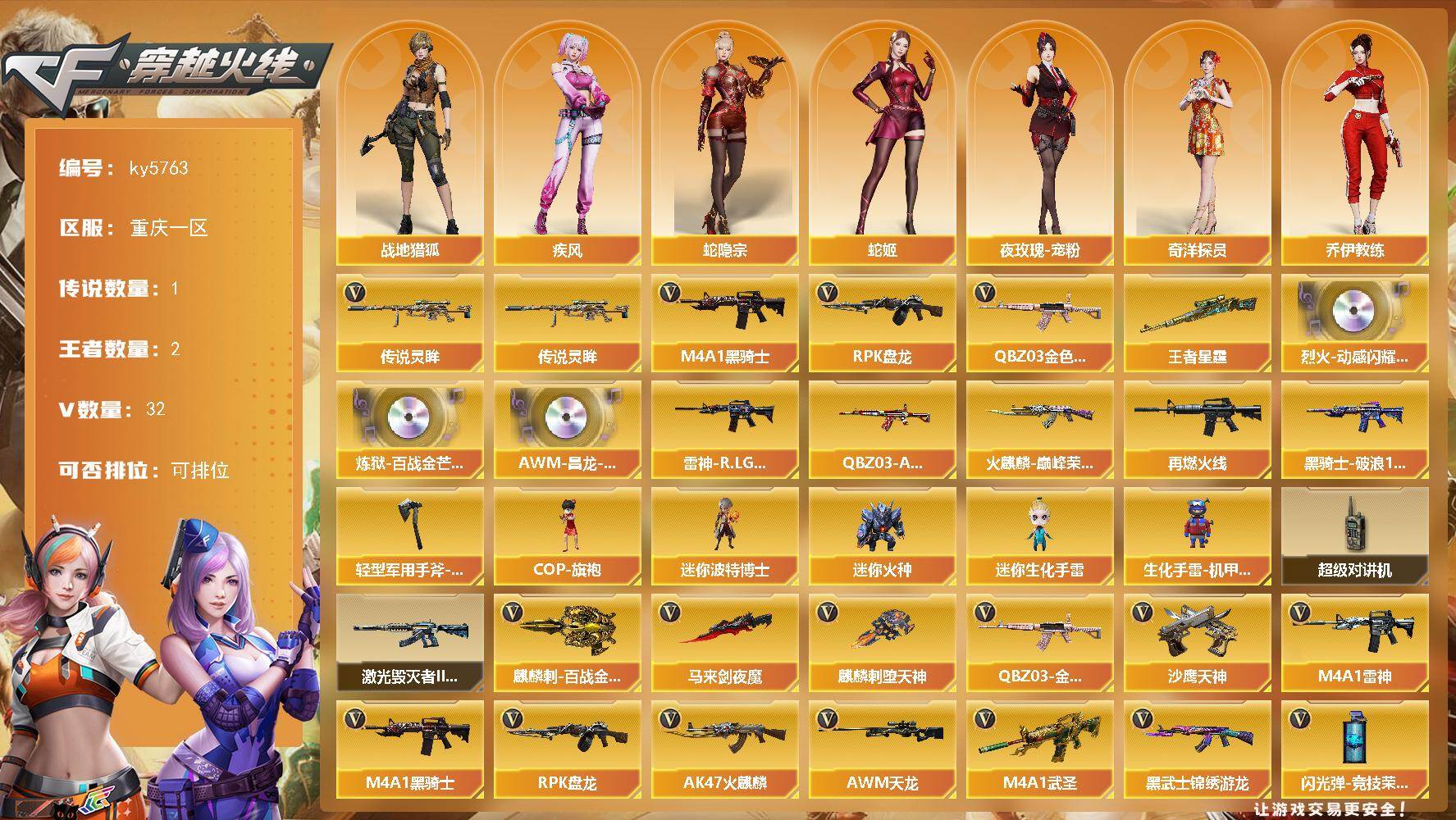 [17611574]【ky5763】重庆一区-33V-2王者武器数-0炫金武器数 【传说武器】:传说灵眸 【热门武器】:传说灵眸,QBZ03-金色蔷薇,M4A1-黑骑士,RPK-盘龙 【王者炫金武器】:王者星霆 【音效卡】:烈火-动感闪耀 音效卡,炼狱-百战金芒-庆典舞曲音效卡,AWM-昌龙-怀旧音效卡 【皮肤】:QBZ03-AG-CFPLS19冠军,雷神-R.LGD-CFPLS18冠军,M4A1-再燃火线,火麒麟-巅峰荣耀,黑骑士-破浪10年皮肤,轻型军用手斧-再燃火线 【角色】:战地猎狐,蛇隐宗,奇洋探员,乔伊教练,修道士,空,北极狐-X,风暴女,虎妞,疾风,兰妹妹,青霞仙子,蛇姬,维纳斯,夜玫瑰-宠粉,影武者-X 【人偶武器】:COP-旗袍,迷你波特博士*2,迷你火种,迷你生化手雷,生化手雷-机甲核心 【暴走生化】:超级对讲机 【挑战大师】:激光毁灭者III-白马银枪 【英雄级武器】:AK47-火麒麟,M4A1-雷神,M4A1-黑骑士,M4A1-武圣*2,黑武士-锦绣游龙,QBZ03-金色蔷薇,AWM-天龙,RPK-盘龙,炼狱-百战金芒,炼狱-悦蓝-觉醒版,沙鹰-天神*3,麒麟刺-堕天神,马来剑-夜魔,麒麟刺-百战金芒,高爆手雷-堕天神,高爆手雷-夜魔,高爆手雷-竞技荣光,高爆手雷-古蛇迷踪,闪光弹-堕天神,闪光弹-夜魔,闪光弹-竞技荣光*2,烟雾弹-堕天神,烟雾弹-夜魔,烟雾弹-竞技荣光,M4A1-赤狱骑士,AWM-昌龙 【道具】:泡泡象背包,BS战队炫彩背包,CFS限定背包,亚洲杯纪念炫彩背包,奇洋探员-海龟背包,女皇终结者-背包,炫彩背包-诺拉,百战金芒炫彩背包,背包-洛丽塔,虎牙炫彩背包,超级背包,女皇终结者-魔龙之吻,救世主-黑桃战神,黄金生化钩,绿色巨人,灵魂忍者,迷雾幽灵,生化弹匣,夺命之镰,防化服*3,金色流光-枪王排位,星辰流光-枪王排位,流光-再燃火线,枪王排位28赛季金色流光,枪王排位29赛季金色流光,语音特效-盛典烟火,蛇隐宗表情,萌萌小葵表情,EP战队名片,EP战队喷图,C4-再燃火线,防弹头盔*5,防弹衣*5,C4工具钳*5,手雷包*5 【特殊枪械】:1黑骑士,1盘龙