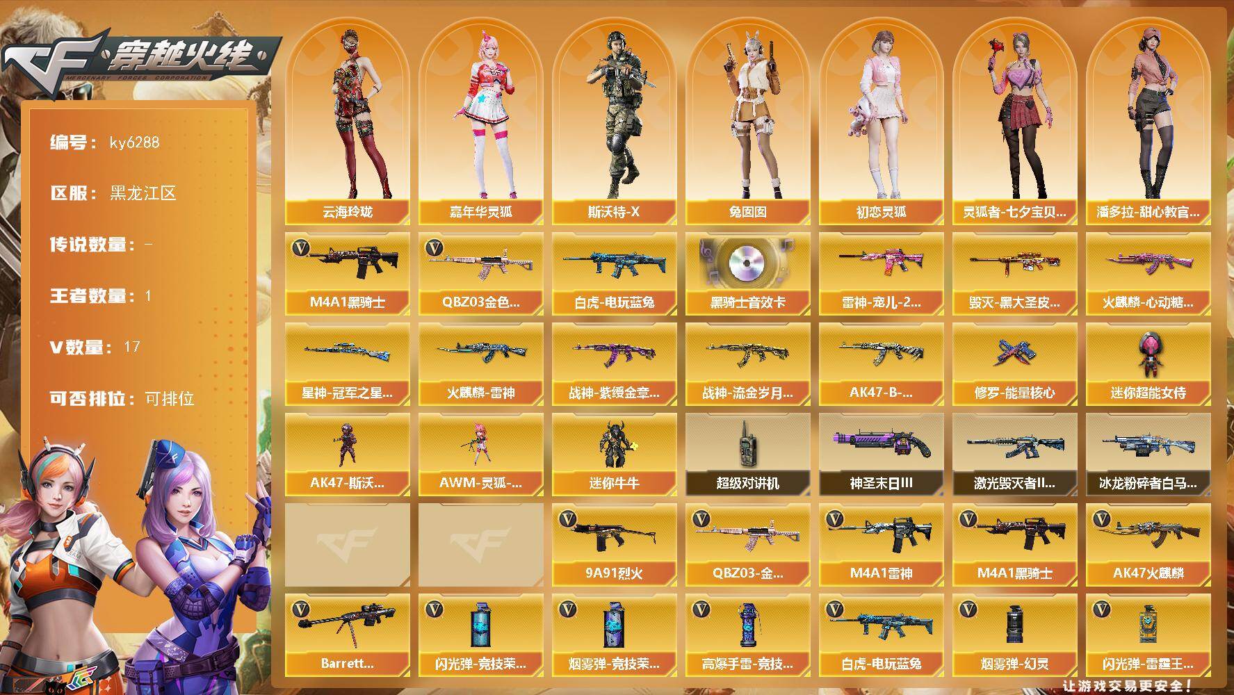 [17611693]【ky6288】黑龙江区-22V-1王者武器数-0炫金武器数 【热门武器】:QBZ03-金色蔷薇,白虎-电玩蓝兔,M4A1-黑骑士 【音效卡】:M4A1-黑骑士音效卡 【皮肤】:Kar98K-星神-冠军之星皮肤,雷神-宠儿-2019MVP,火麒麟-雷神,火麒麟-心动糖果,毁灭-黑大圣皮肤,战神-紫绶金章皮肤*2,战神-流金岁月皮肤,AK47-B-常胜将军-刘备,修罗-能量核心 【角色】:云海玲珑,暗夜-X,初恋灵狐,芳心审判者,风暴女,嘉年华灵狐,灵狐者-X,灵狐者-七夕宝贝,龙儿-小淘气,曼陀罗-X,潘多拉-X,潘多拉-甜心教官,斯沃特-X,兔囡囡,新娜塔莎 【人偶武器】:AWM-灵狐-15周年嘉年华,迷你牛牛,AK47-斯沃特,迷你超能女侍 【暴走生化】:超级对讲机 【挑战大师】:冰龙粉碎者-白马银枪,激光毁灭者III-白马银枪,神圣爆裂者-末日III 【英雄级武器】:AK47-火麒麟*2,M4A1-雷神,M4A1-黑骑士,QBZ03-金色蔷薇,9A91-烈火,白虎-电玩蓝兔,Barrett-毁灭,Barrett-暗月传说,高爆手雷-竞技荣光*2,闪光弹-竞技荣光*2,闪光弹-雷霆王者-觉醒版,烟雾弹-幻灵,烟雾弹-竞技荣光*2,AK47-竞魂无影 【源级武器】:魂·火麒麟-百城,火麒麟-雷神,魂·M4A1-雷神-化蛇,魂·雷神-15周年嘉年华,御·雷神-机甲刑天,御·雷神-烈虎*2,M4A1-十二生肖·龙-雷神,御·雷神-小白龙,魂·黑骑士-摸金校尉,魂·黑骑士-现代金属*3,魂·黑骑士-幻能朋克*2,魂·黑骑士-破浪10年,御·黑骑士·哪吒闹海,源·无影,魂-死神-机甲核心,源·武圣*2,源·机械迷城,魂·龙血-锋芒破茧*2,金色蔷薇-狼王,魂·QBZ03-金色蔷薇-萌杀*2,源·猎神*2,魂·裁决-凤灵,魂·裁决-新人王绿豆*2,源·毁灭,魂·毁灭-青帝,魂·毁灭-神秘黑洞,御·毁灭-黑大圣,魂·炼狱-玩具枪,魂·修罗-15周年嘉年华,魂·修罗-现代金属,魂·天神-宇航兔兔,源·武圣glock,魂·屠龙-春桃,源·擎天-萌杀,源·龙啸*2 【道具】:虎牙炫彩背包,超级背包,夺命之镰,防化服,金色流光-枪王排位*2,星辰流光-枪王排位,枪王排位28赛季金色流光,电玩兔兔表情,EP战队名片,防弹头盔*2,防弹衣,C4工具钳*2,手雷包*2 【特殊枪械】:1黑