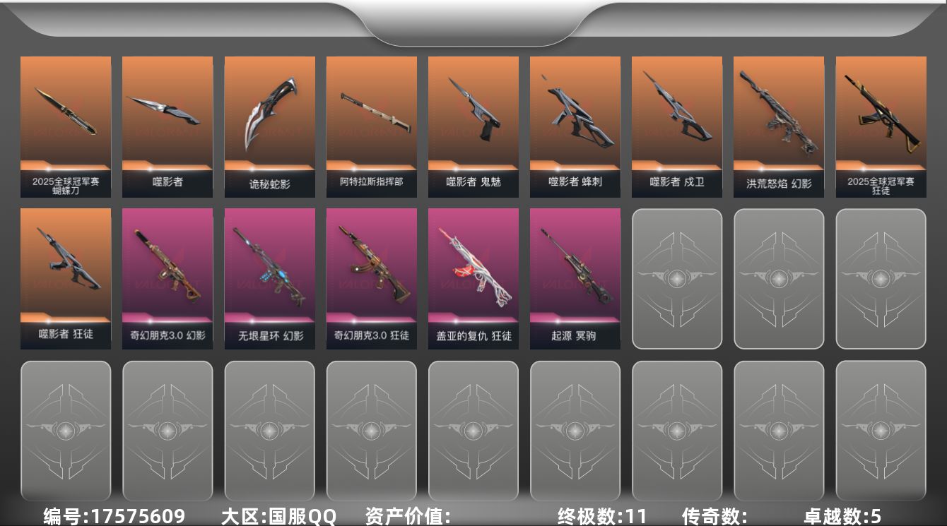 [17575609]【套装】:2025全球冠军赛套装,噬影者套装 【英雄】:幻棱,炼狱,维斯,暮蝶,壹决,铁臂,捷风,雷兹,幽影,不死鸟,贤者,猎枭,蝰蛇,零,芮娜,尚勃勒,霓虹,夜露,K/O,盖可,黑梦,钢锁 【近战武器】:近战武器-2025全球冠军赛 蝴蝶刀,近战武器-魔术火花,近战武器-噬影者 簇刃,近战武器-诡秘蛇影 军刀,近战武器-阿特拉斯指挥部 甩棍,近战武器-魔术火花 【狂徒】:狂徒-2025全球冠军赛,狂徒-噬影者,狂徒-盖亚的复仇,狂徒-奇幻朋克//3.0,狂徒-诡秘蛇影 【幻影】:幻影-洪荒怒焰,幻影-无垠星环,幻影-奇幻朋克//3.0,幻影-末日之翼 【戍卫】:戍卫-噬影者,戍卫-折光棱晶 【冥驹】:冥驹-起源 【飞将】:飞将-末日之翼 【莽侠】:莽侠-诡秘蛇影 【奥丁】:奥丁-末日之翼 【判官】:判官-诡秘蛇影 【蜂刺】:蜂刺-噬影者,蜂刺-折光棱晶 【标配】:标配-神罚,标配-折光棱晶 【鬼魅】:鬼魅-噬影者,鬼魅-诡秘蛇影 【短炮】:短炮-末日之翼 【卡面】:欢迎来到底城 卡面,南瓜盛典 卡面,梦幻奶茶 卡面,源能反应 卡面,零点嗅探设计图 卡面,代号红色 卡面,新兵报到 卡面,V契约 卡面,无畏契约 卡面 【喷漆】:都算到了 喷漆,我的刀呢? 喷漆,胜利属于无畏契约 喷漆,GLHF 喷漆,无畏契约 喷漆 【挂饰】:第九季//第三幕 纪念币 挂饰,迷你K/O 挂饰,第八季//第三幕 纪念币 挂饰,无畏契约 纪念币 挂饰