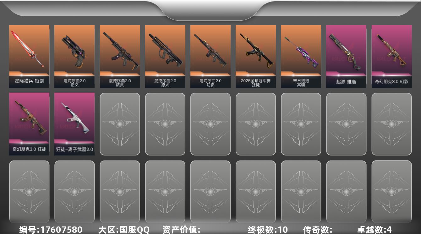 [17607580]【套装】:混沌序曲//2.0套装 【英雄】:幻棱,炼狱,暮蝶,壹决,铁臂,捷风,雷兹,幽影,不死鸟,贤者,猎枭,零,芮娜,尚勃勒,霓虹,斯凯,夜露,海神,盖可,黑梦,钢锁 【近战武器】:近战武器-碎心裂刃,近战武器-混沌链枷,近战武器-魔术火花,近战武器-星际猎兵 短剑,近战武器-魔术火花 【狂徒】:狂徒-2025全球冠军赛,狂徒-离子武器//2.0,狂徒-奇幻朋克//3.0 【幻影】:幻影-混沌序曲//2.0,幻影-奇幻朋克//3.0 【獠犬】:獠犬-混沌序曲//2.0 【冥驹】:冥驹-末日泡泡 【雄鹿】:雄鹿-起源 【骇灵】:骇灵-混沌序曲//2.0,骇灵-无限竞技 【正义】:正义-混沌序曲//2.0 【卡面】:红鳞松叶 卡面,无畏契约GO!第一卷:芮娜 卡面,无畏契约GO!第一卷:零 卡面,钢锁vs盖可 卡面,代号红色 卡面,新兵报到 卡面,V契约 卡面,无畏契约 卡面 【喷漆】:买装还是存钱 喷漆,关门放狗 喷漆,胜利属于无畏契约 喷漆,GLHF 喷漆,无畏契约 喷漆 【挂饰】:无畏契约GO!第一卷 零 挂饰,天外飞客 挂饰,《双城之战》魄罗 挂饰,无畏契约 纪念币 挂饰