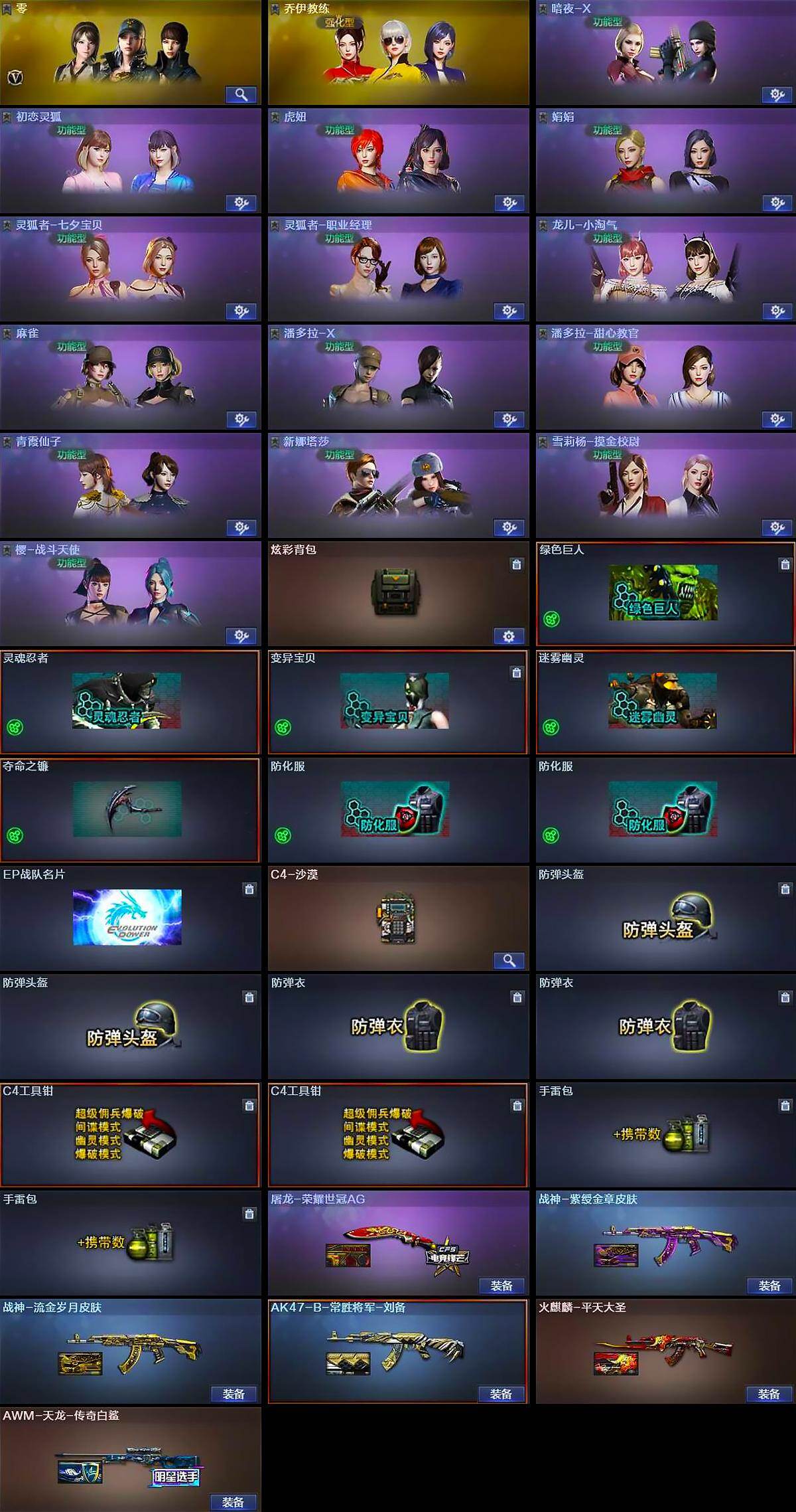 【角色】:零,乔伊教练,暗夜-X,初恋灵狐,虎妞,娟娟,灵狐者-七夕宝贝,灵狐者-职业经理,龙儿-小淘气,麻雀,潘多拉-X,潘多拉-甜心教官,青霞仙子,新娜塔莎,雪莉杨-摸金校尉,樱-战斗天使