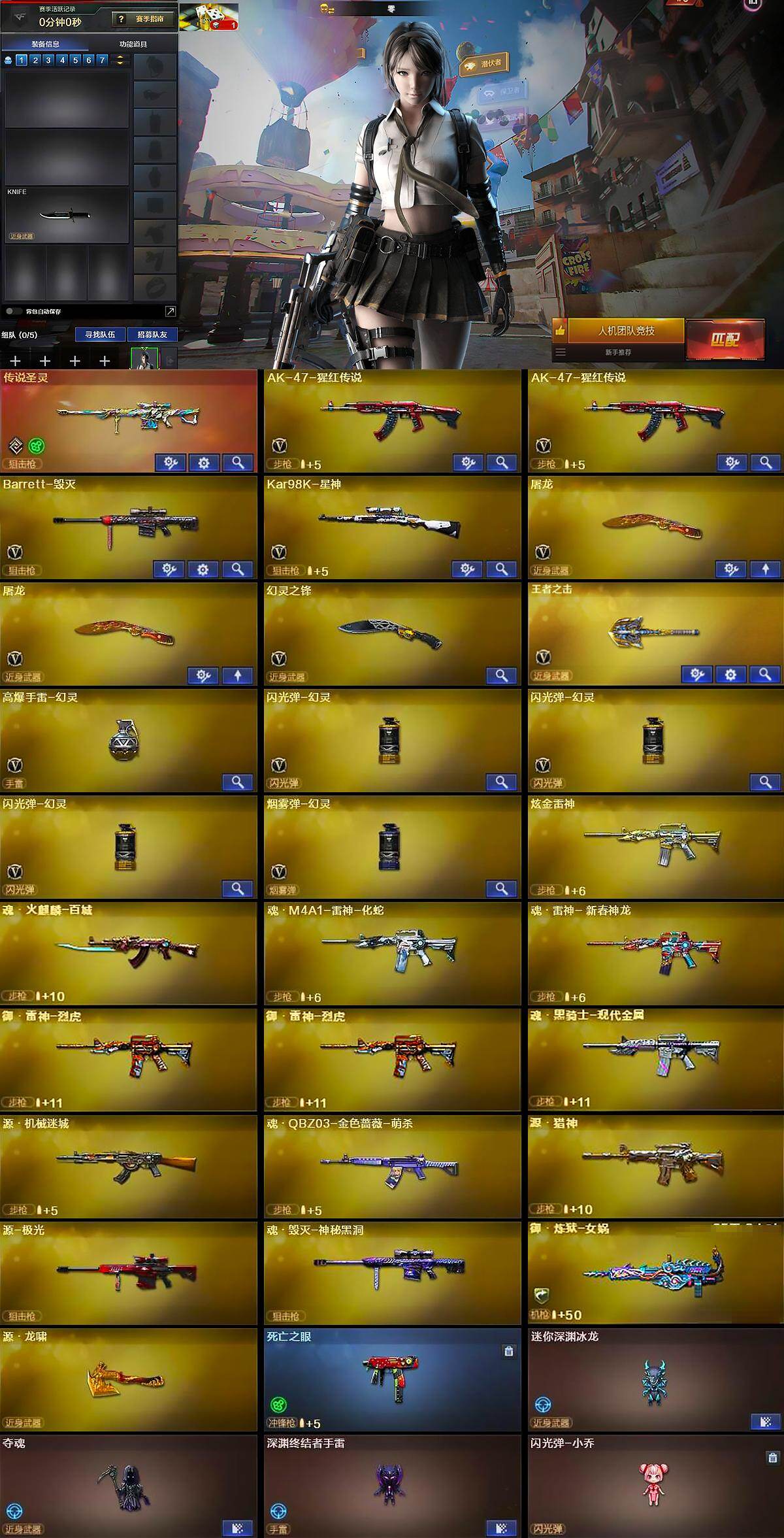 【英雄级武器】:AK-47-猩红传说*2,Barrett-毁灭,Kar98K-星神,屠龙*2,幻灵之锋,王者之击-觉醒版,高爆手雷-幻灵,闪光弹-幻灵*3,烟雾弹-幻灵
