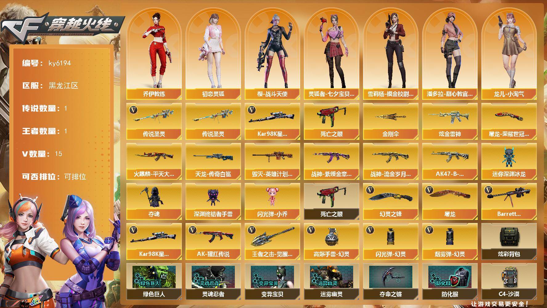 [17614241]【ky6194】黑龙江区-16V-1王者武器数-1炫金武器数 【传说武器】:传说圣灵 【热门武器】:传说圣灵,死亡之眼,Kar98K-星神,金刚伞 【王者炫金武器】:炫金雷神 【皮肤】:火麒麟-平天大圣,毁灭-英雄计划 皮肤,战神-紫绶金章皮肤,战神-流金岁月皮肤,AK47-B-常胜将军-刘备,AWM-天龙-传奇白鲨,屠龙-荣耀世冠AG 【角色】:零,乔伊教练,暗夜-X,初恋灵狐,虎妞,娟娟,灵狐者-七夕宝贝,灵狐者-职业经理,龙儿-小淘气,麻雀,潘多拉-X,潘多拉-甜心教官,青霞仙子,新娜塔莎,雪莉杨-摸金校尉,樱-战斗天使 【人偶武器】:迷你深渊冰龙,夺魂,深渊终结者手雷,闪光弹-小乔 【暴走生化】:死亡之眼 【英雄级武器】:AK-47-猩红传说*2,Barrett-毁灭,Kar98K-星神,屠龙*2,幻灵之锋,王者之击-觉醒版,高爆手雷-幻灵,闪光弹-幻灵*3,烟雾弹-幻灵 【道具】:炫彩背包,绿色巨人,灵魂忍者,变异宝贝,迷雾幽灵,夺命之镰,防化服*2,EP战队名片,C4-沙漠,防弹头盔*2,防弹衣*2,C4工具钳*2,手雷包*2 【特殊枪械】: