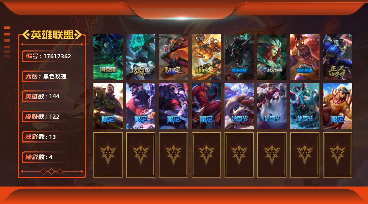 [17617362]【特价出售/店主推荐】白银段位-144英雄-122皮肤-13炫彩-0终极-2神话-18限定-16传说-34史诗