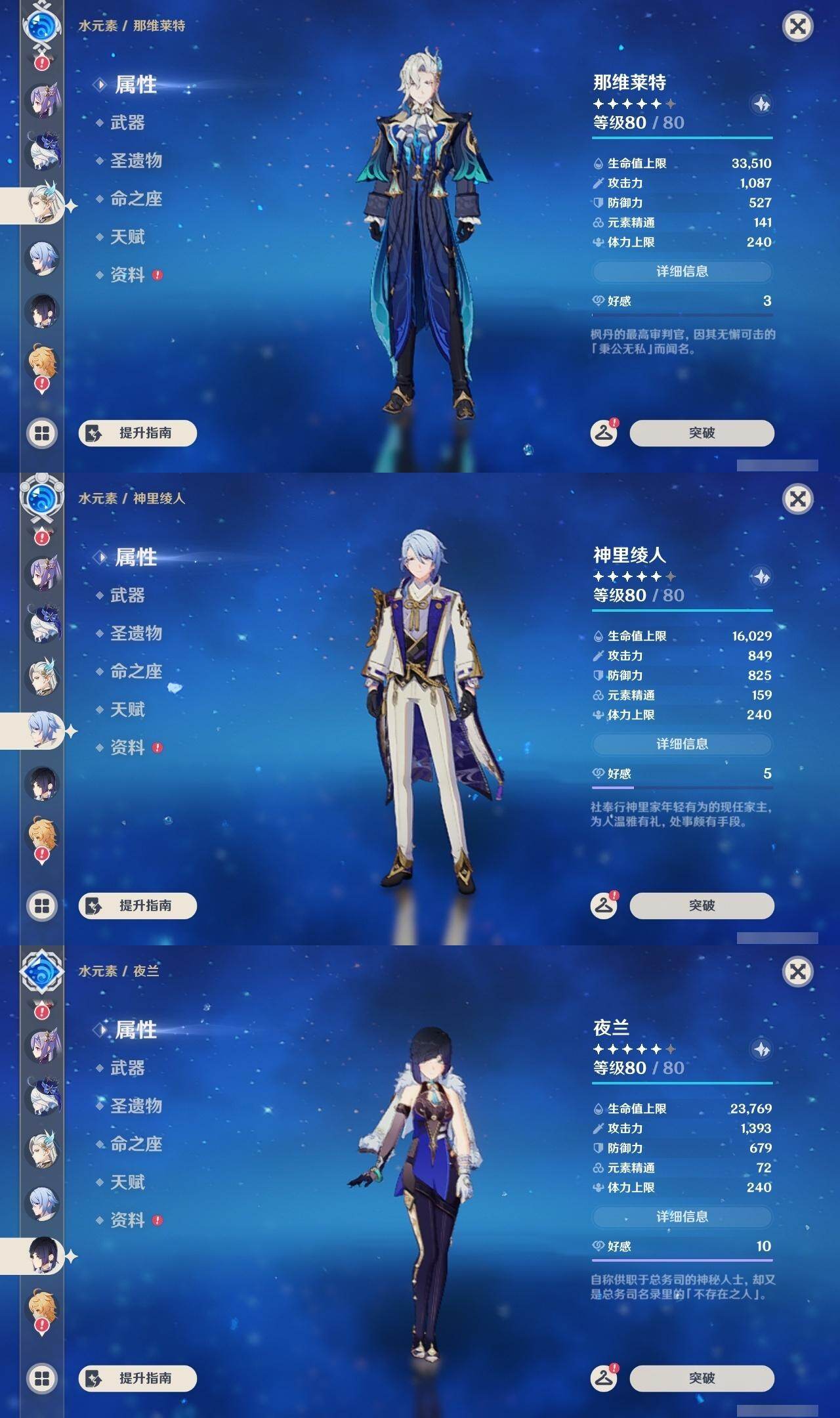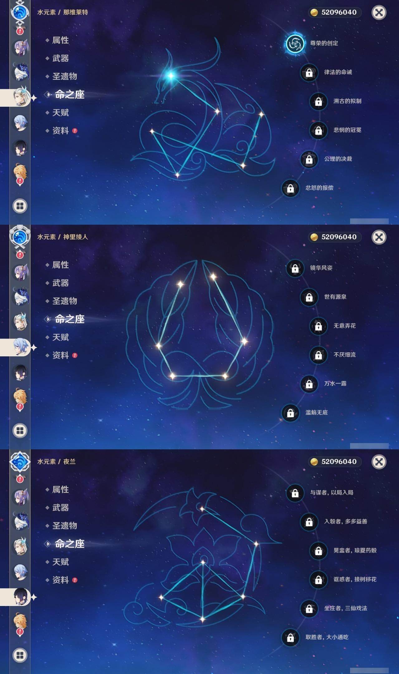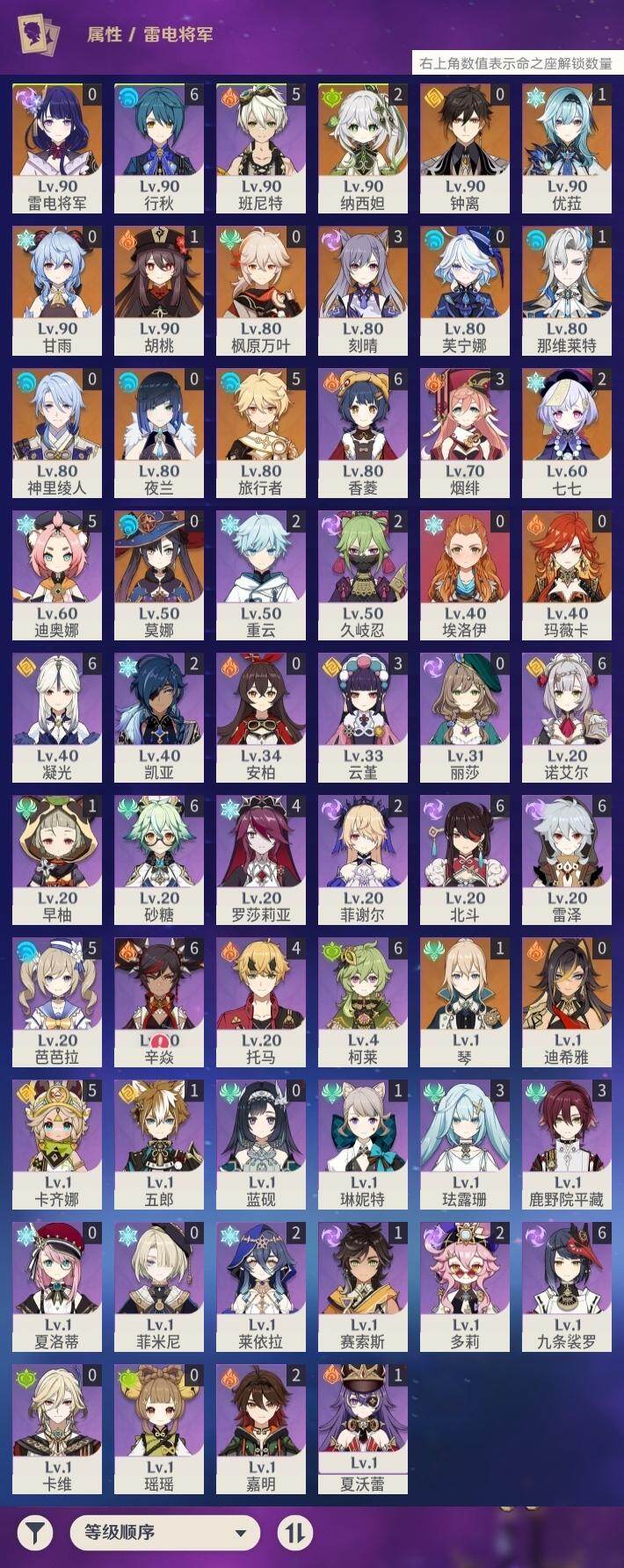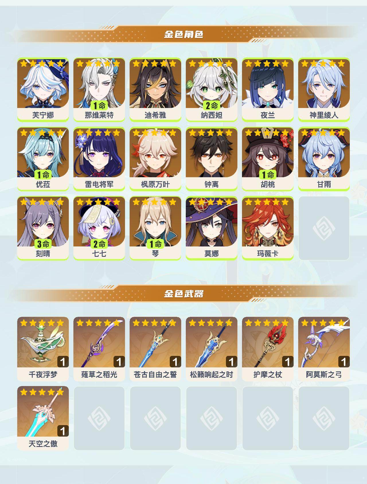 0命芙宁娜,1命那维莱特,0命迪希雅,2命纳西妲,0命夜兰,0命神里绫人,1命优菈,0命雷电将军,0命枫原万叶,0命钟离,1命胡桃,0命甘雨,3命刻晴,2命七七,1命琴,0命莫娜,0命玛薇卡,精1千夜浮梦,精1薙草之稻光,精1苍古自由之誓,精1松籁响起之时,精1护摩之杖,精1阿莫斯之弓,精1天空之傲